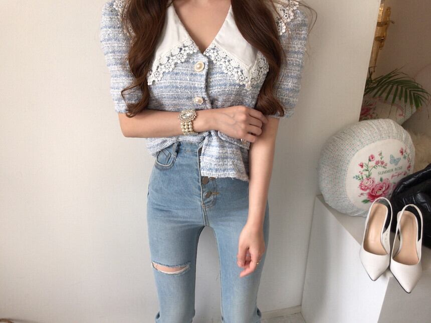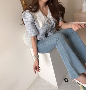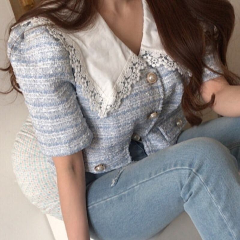 サマーレースカラーツィードショートコート ジャケット レディース 夏物 ステッチ 韓国婦人7852595383