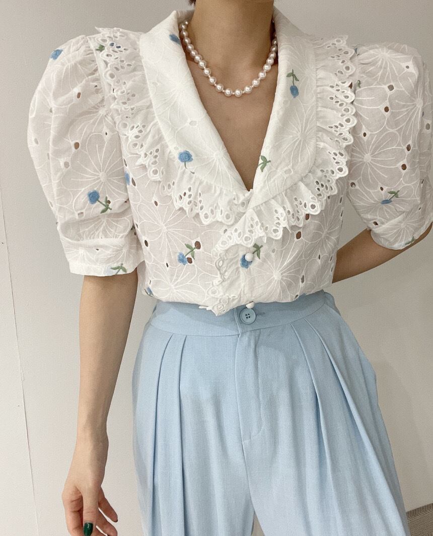 サマーレースVネック刺繍フローラルスリーブシャツ トップス レディース 夏物 花柄 韓国婦人29161383535