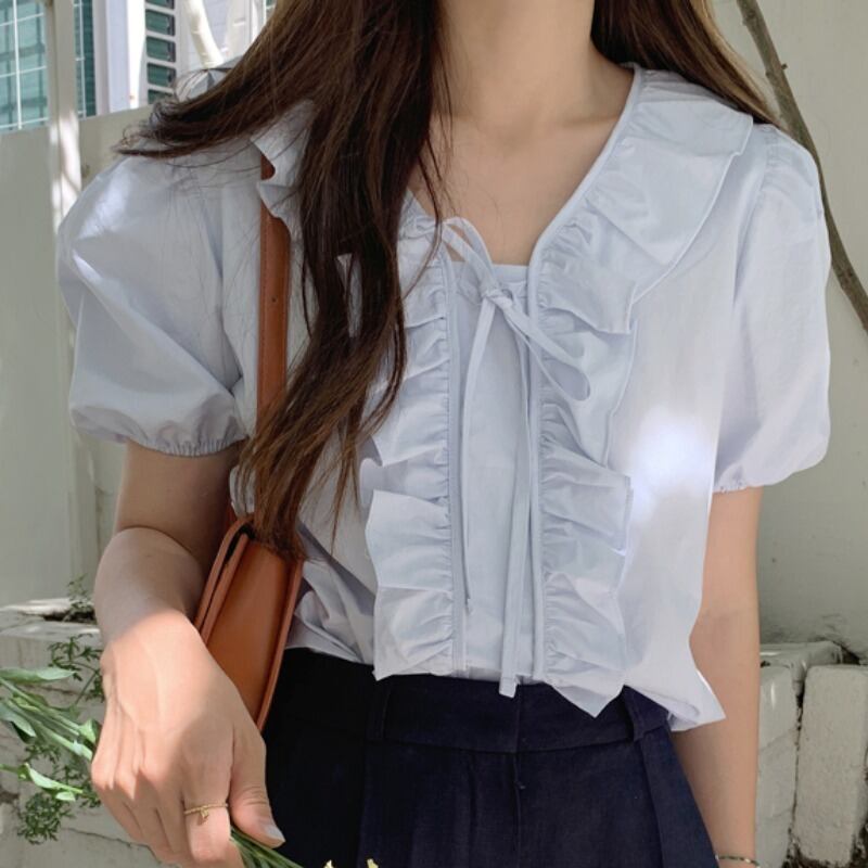 サマーVネックホワイトスリーブシャツ ピンク レース 大人ガーリー スウィート キュート カジュアル 夏物 レースアップ 韓国婦人47392322883