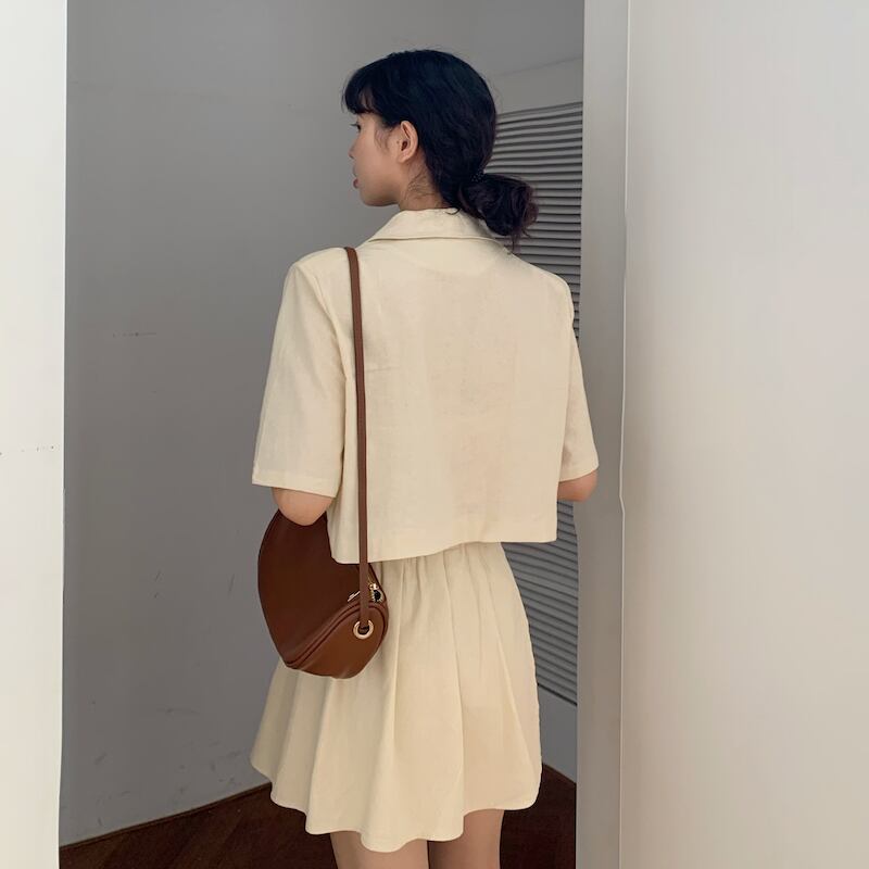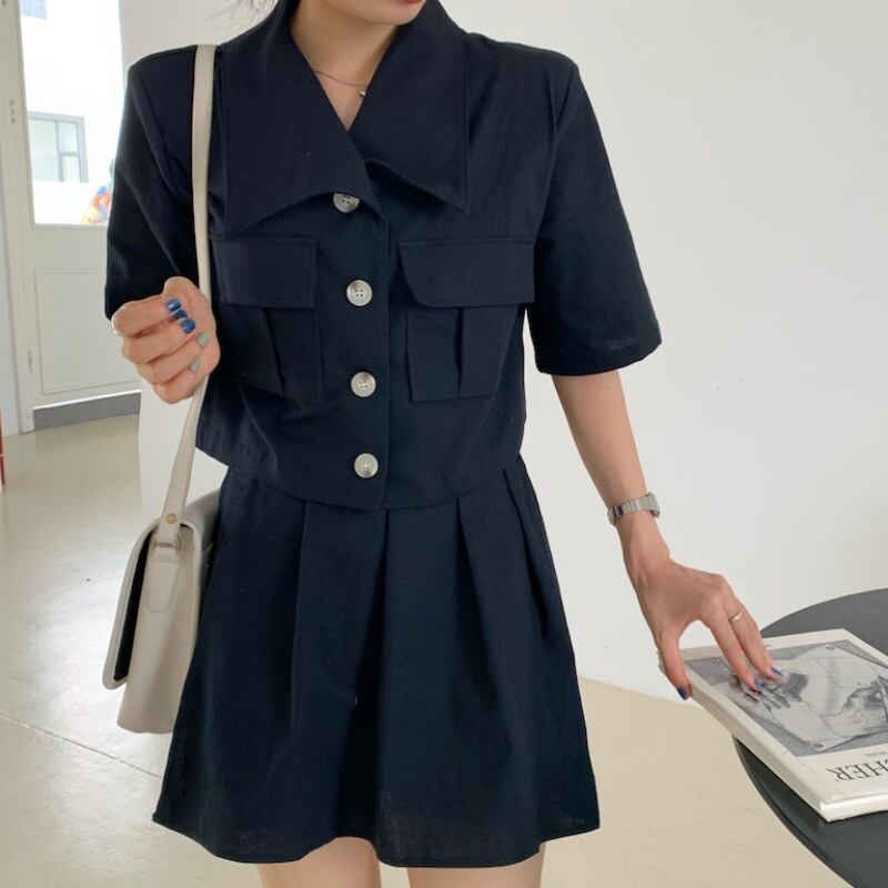 スタンダードスタイルショートジャケット ハイウェストプリーツパンツ スカート カジュアルサマー レトロ 夏物 韓国婦人81630103928