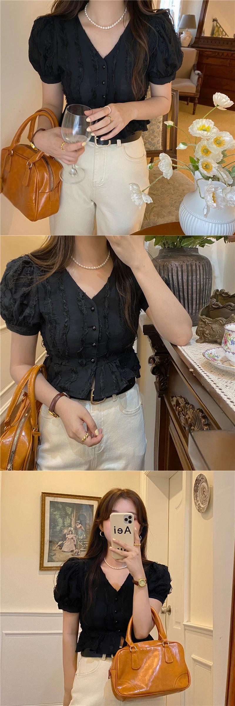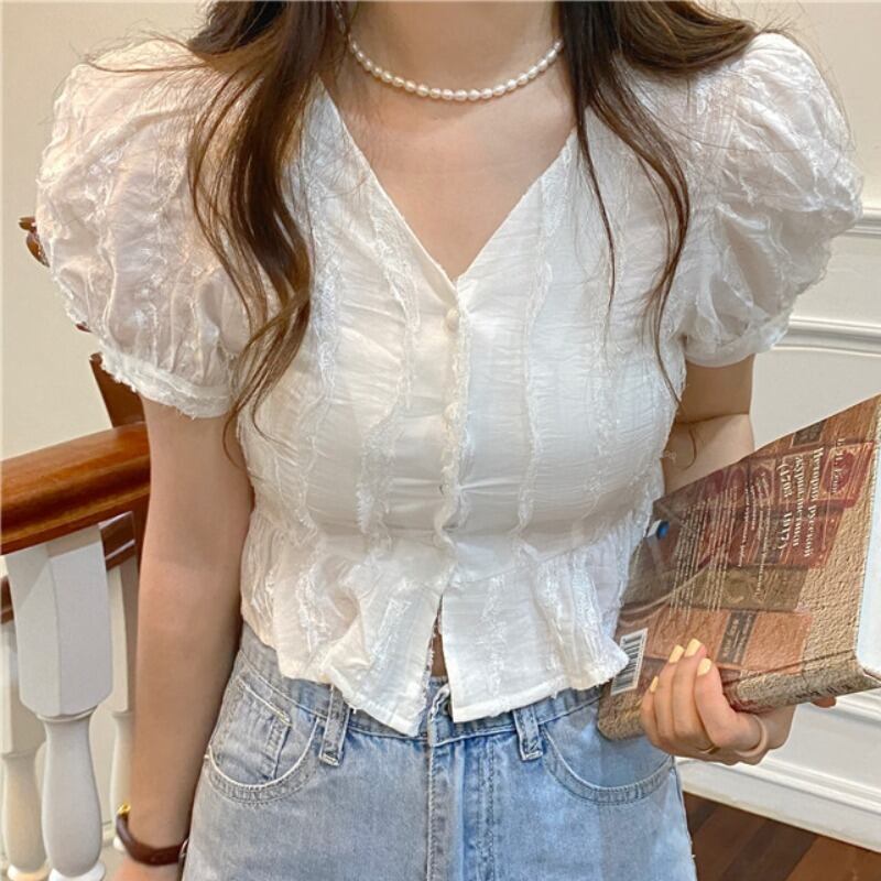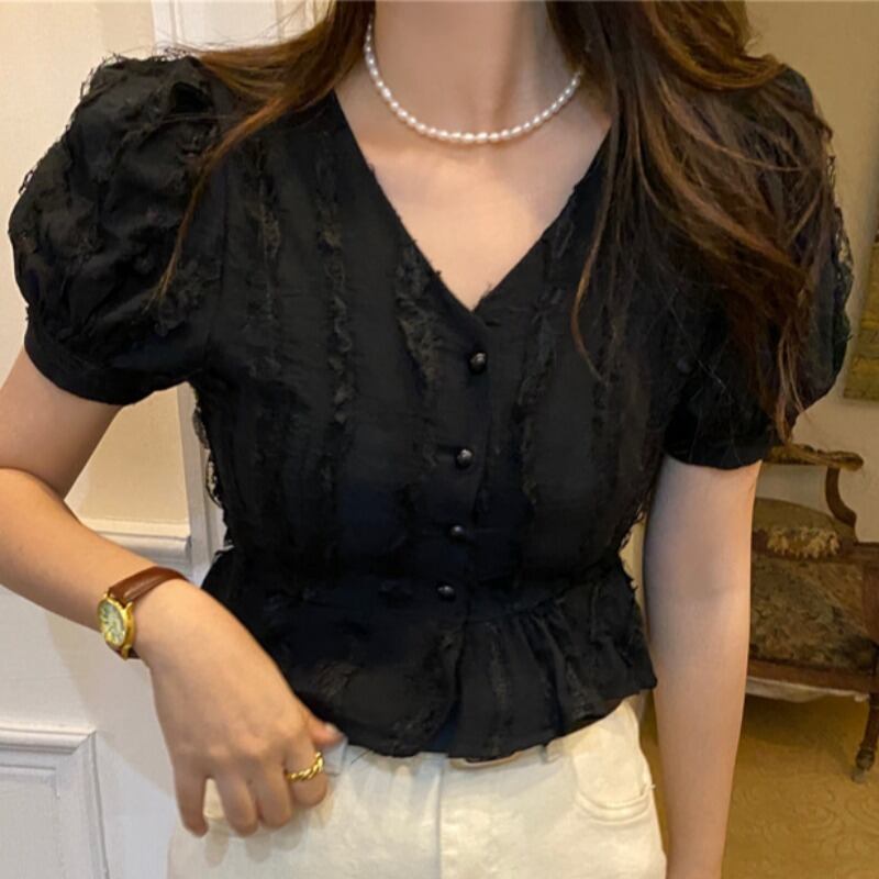 スタイルサマーVネックスリーブレースウェストショートシャツ トップス レディース 大人ガーリー スウィート キュート カジュアル 夏物 韓国婦人29810915548