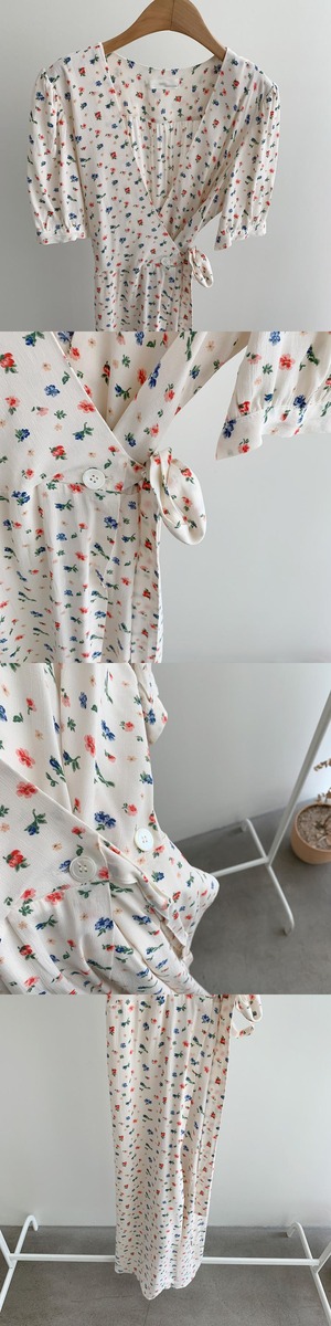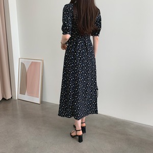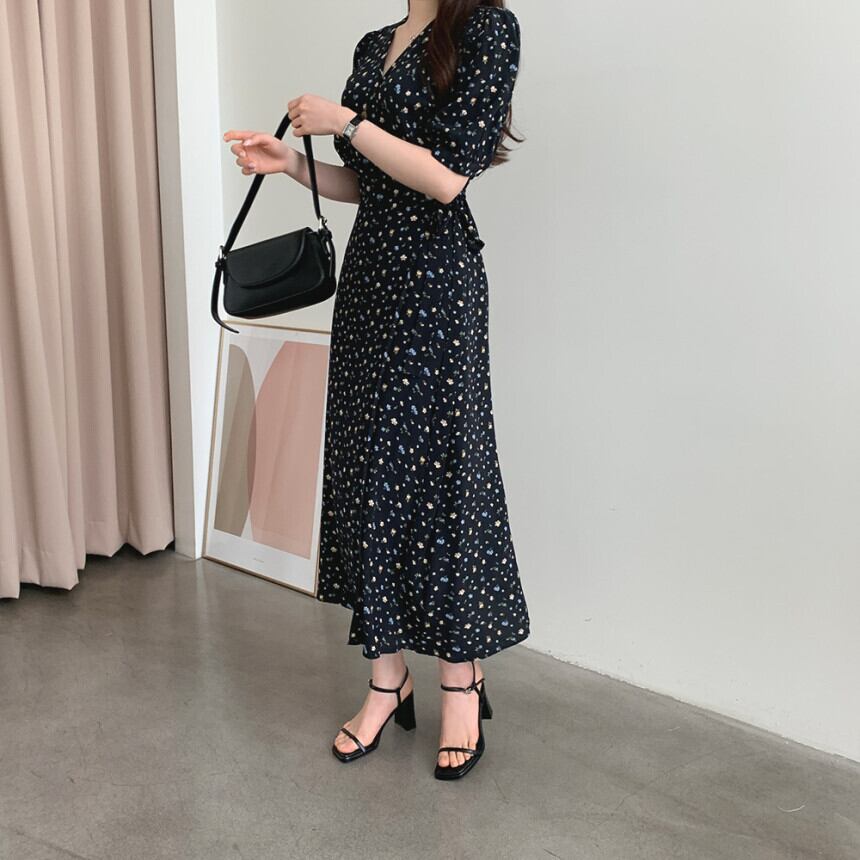 サマーVネックフローラルスリーブドレス スタンダードスタイルロングスカート レトロ 夏物 花柄 韓国婦人96348480081