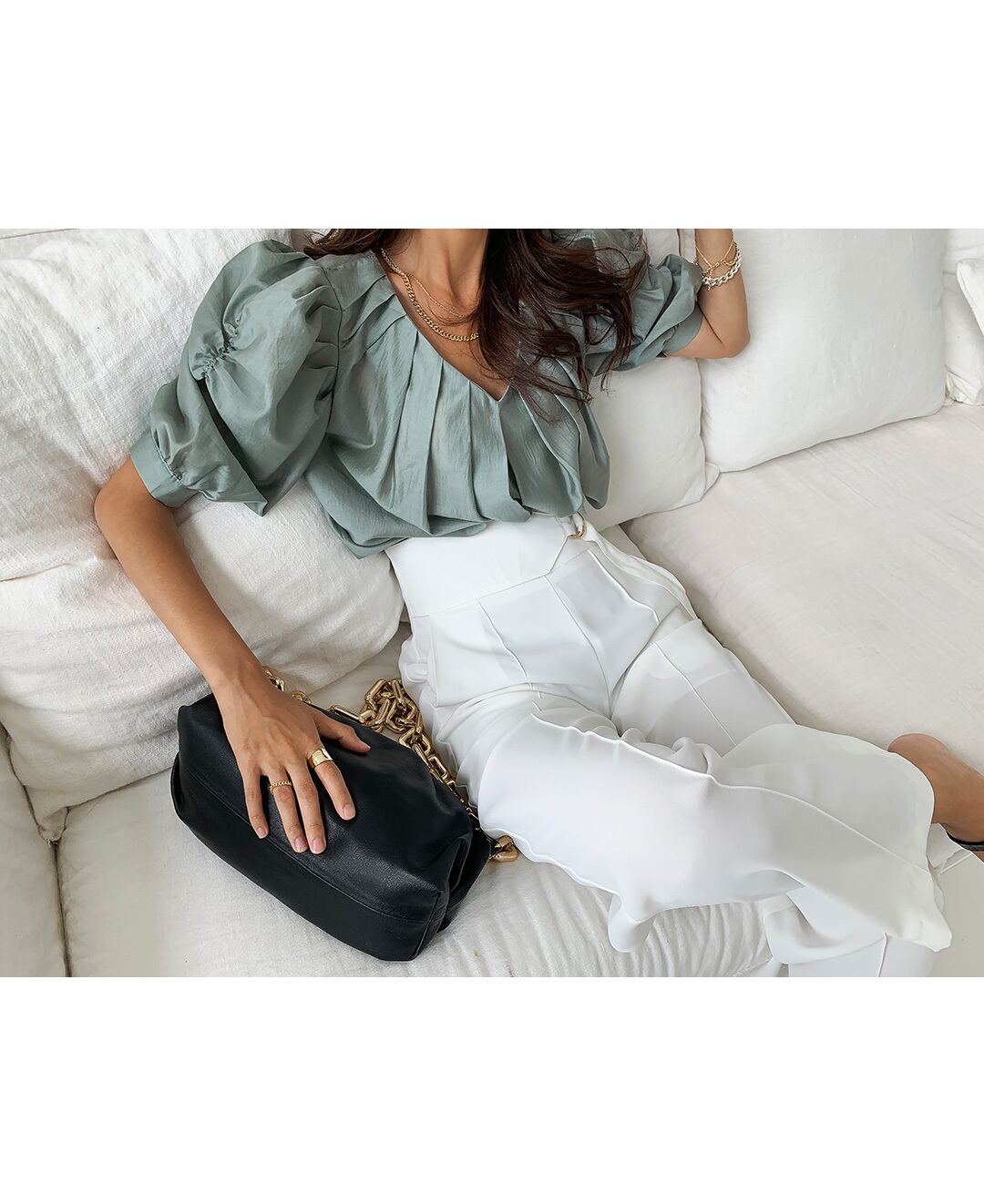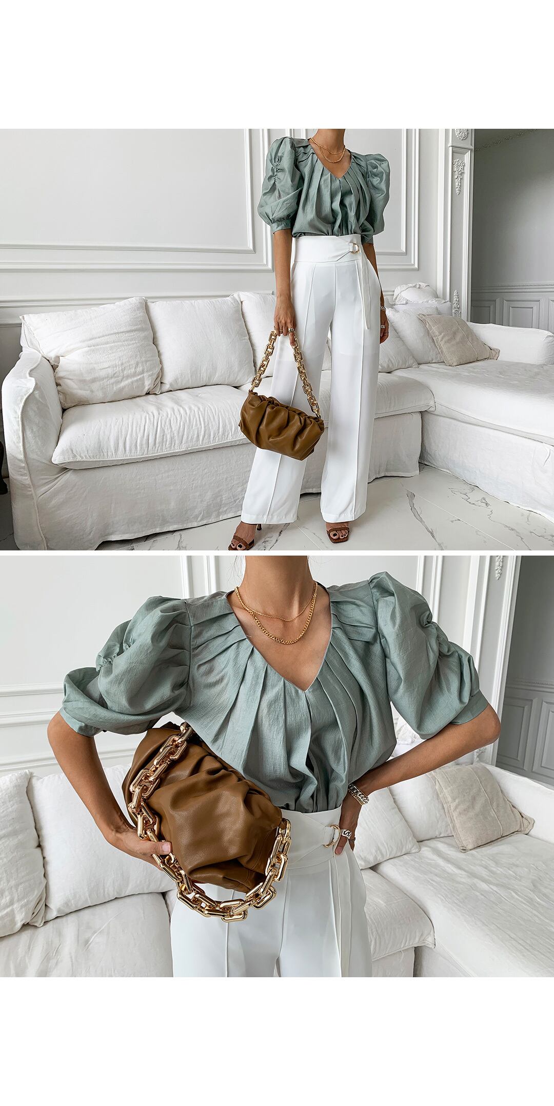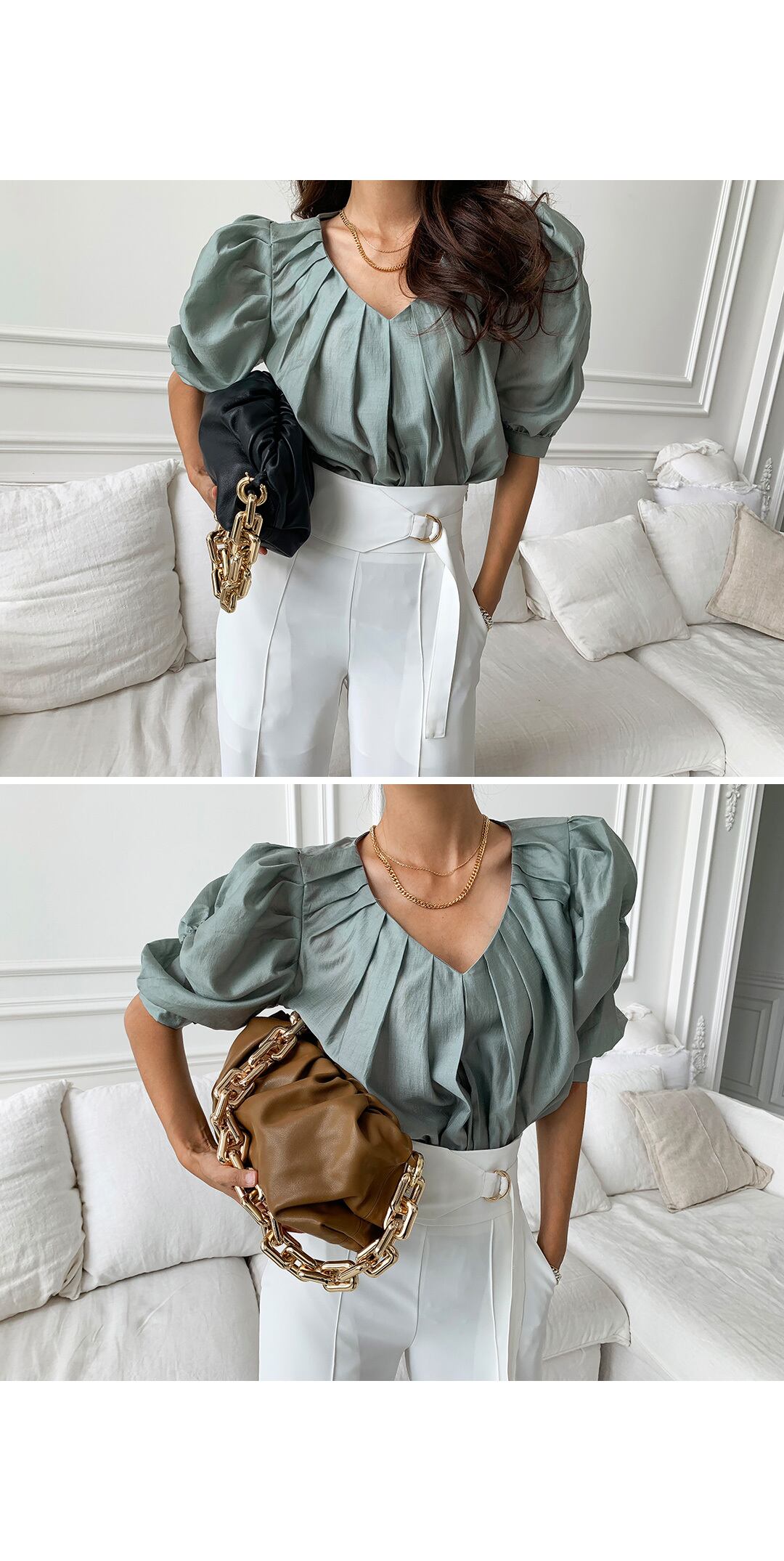 プリーツVネックスリーブシャツ レディースサマースタンダードスタイルルーズ薄手ブラウス レトロ 夏物 韓国婦人20038616035