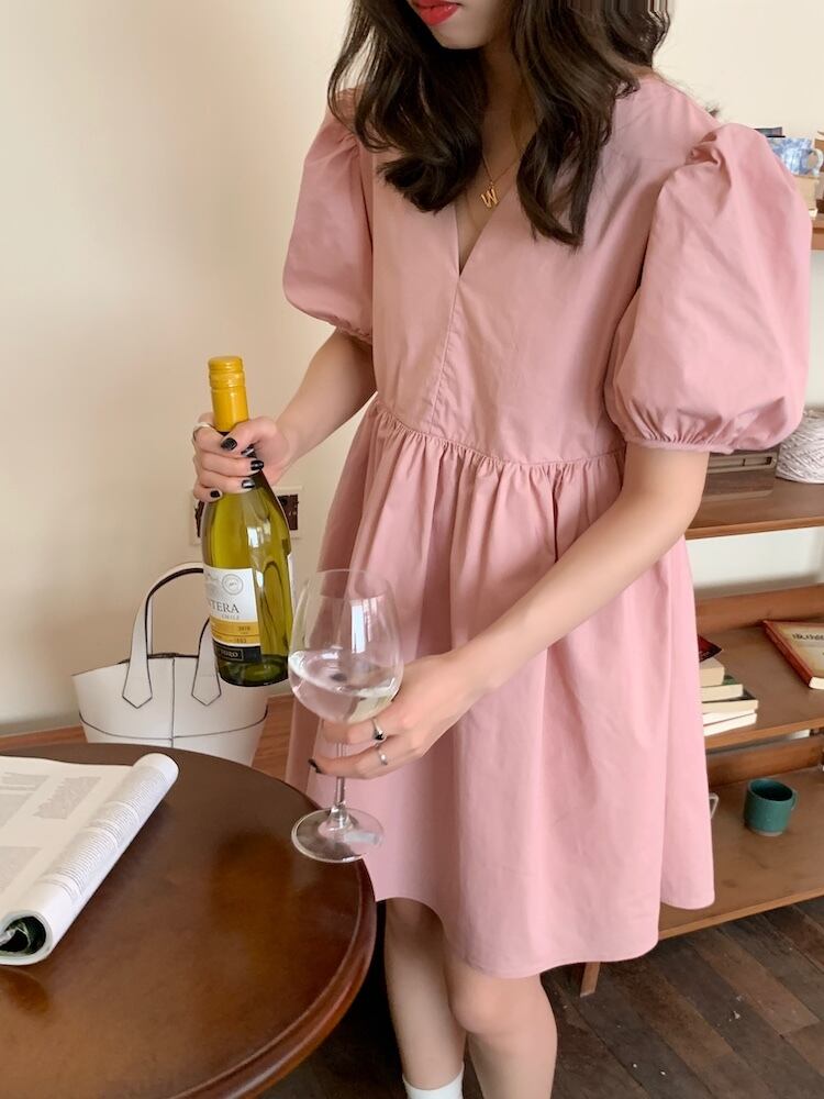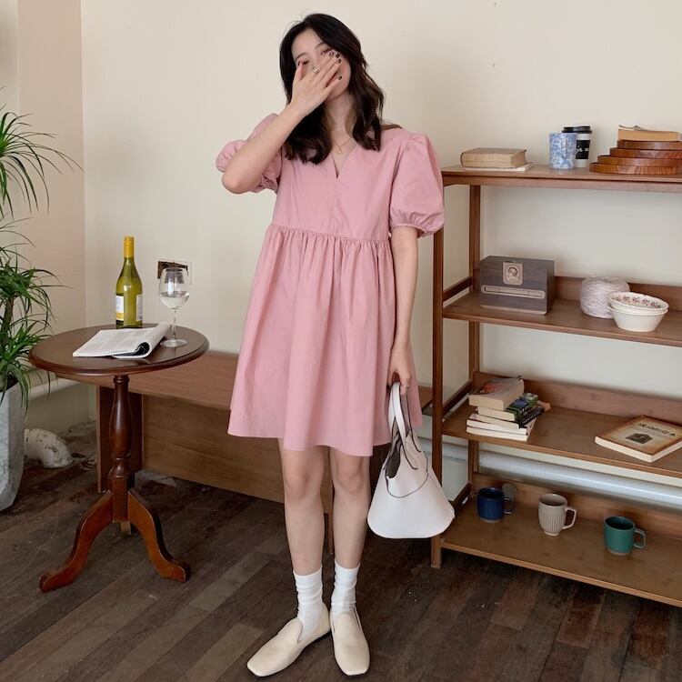 サマーVネックスタンダードスリーブドレス ルーズスカート レトロ 夏物 韓国婦人14176277788