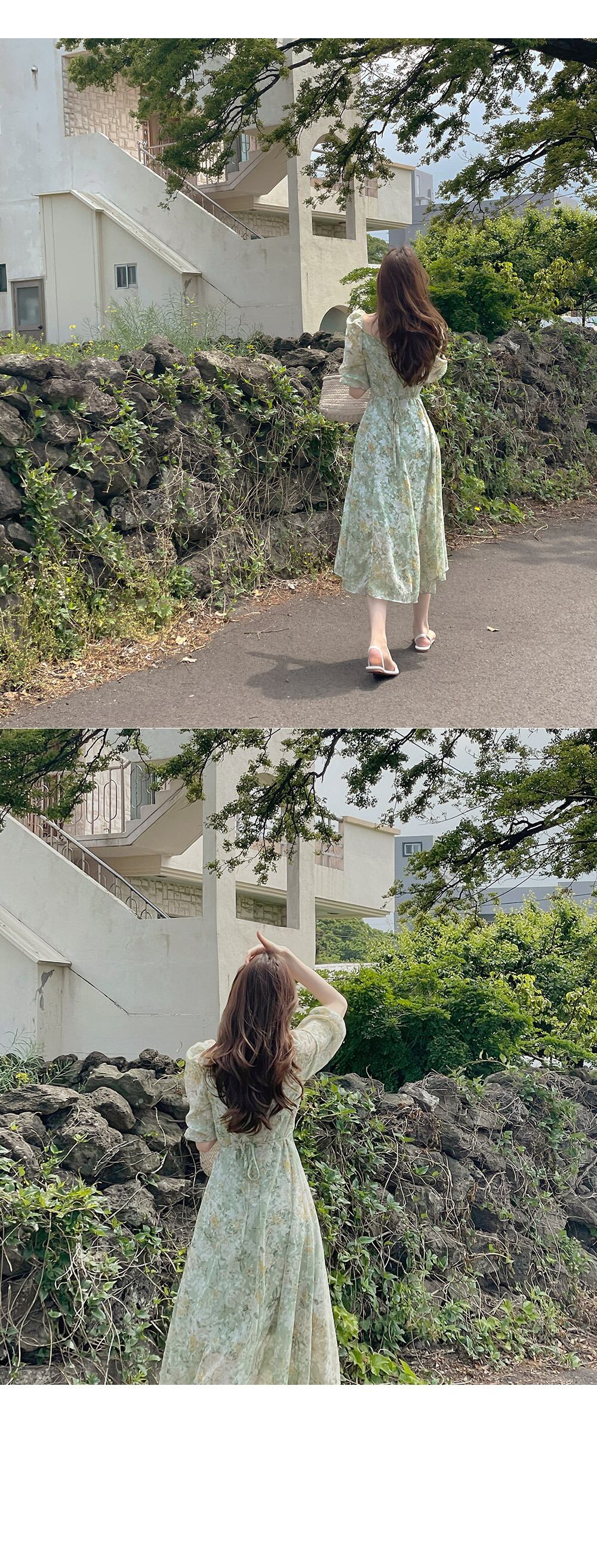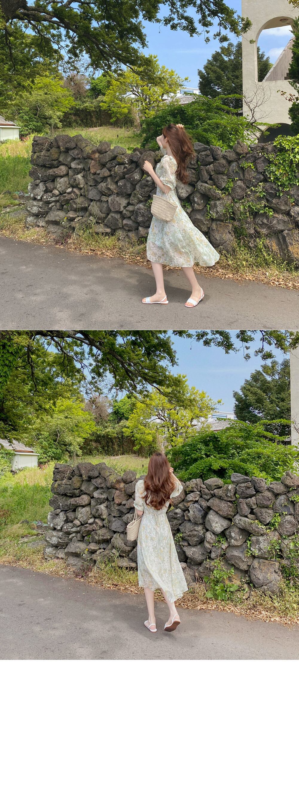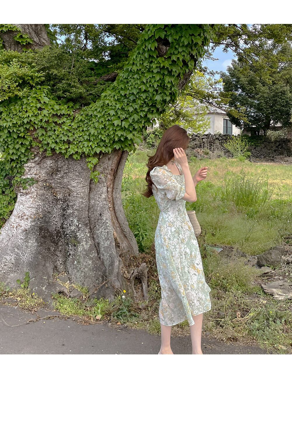 フローラルドレス サマーロングスタイルスタンダードシフォンスカート カラースリーブ レトロ 夏物 花柄 スクウェア 韓国婦人15497110500