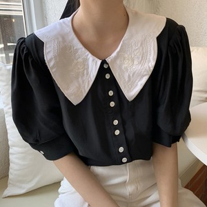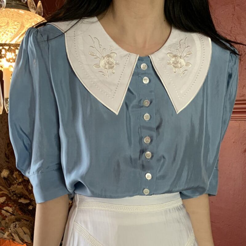 刺繍Flowerデザイン カラースリーブシャツ サマースタンダードスタイルブラウス レトロ 夏物 フラワーデザイン 韓国婦人68098719169