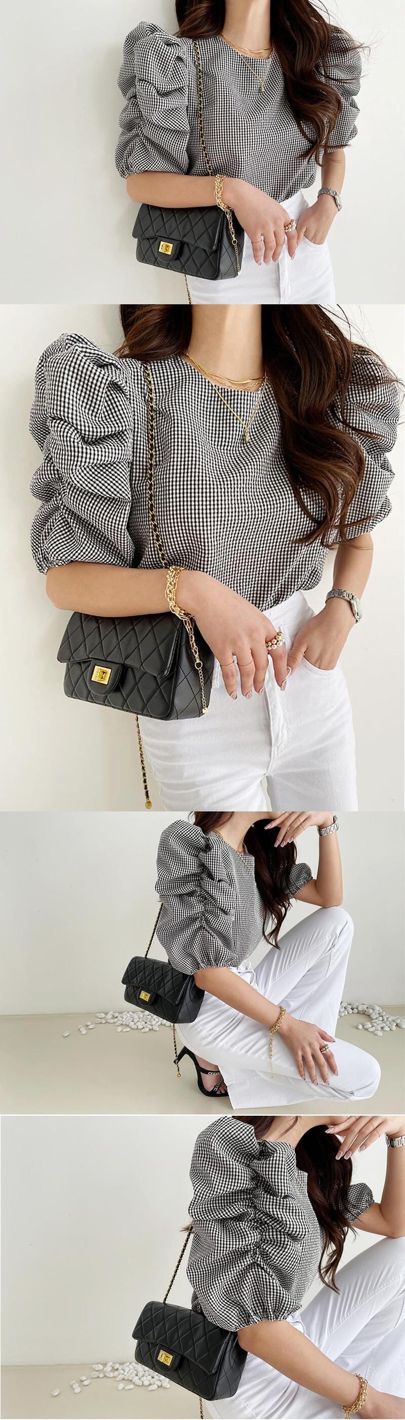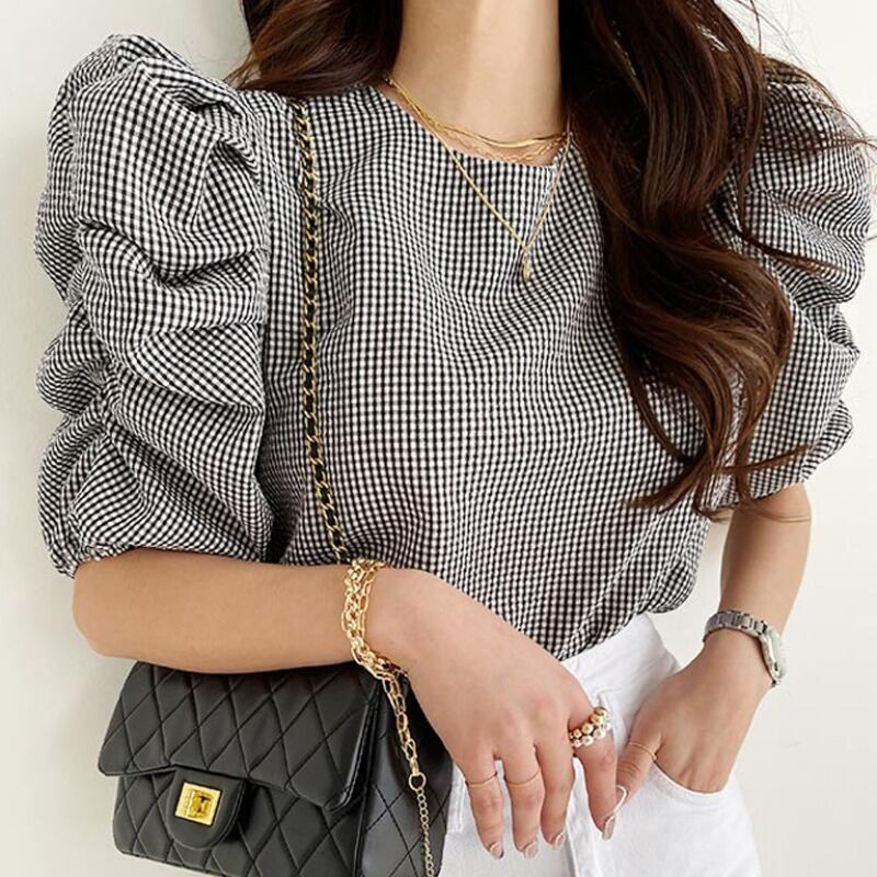 サマースタイル格子柄スリーブシャツ 大人ガーリー スウィート キュート カジュアル 夏物 韓国婦人14847555489