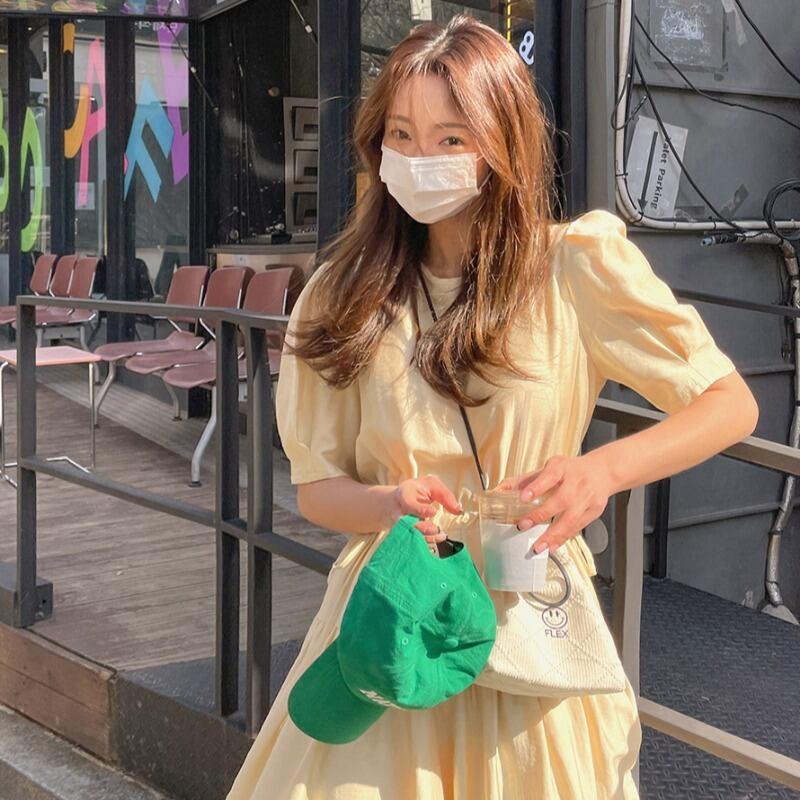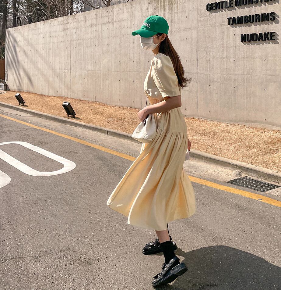 ラウンドネックイエロードレス サマールーズスリーブウェストロングスカート 大人ガーリー スウィート キュート カジュアル 夏物 Oネック 韓国婦人85713313338
