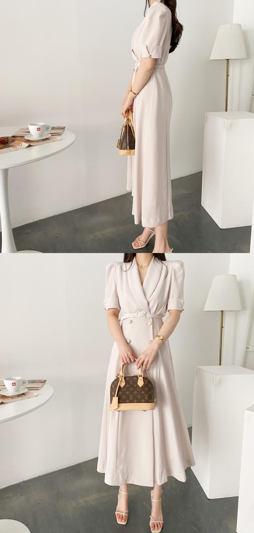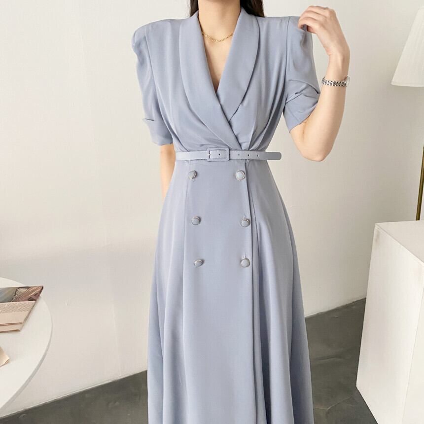 サマーカラーダブルブレストベルト 薄手ドレス ロングスカート 夏物 ハーネス ピュア 韓国婦人17600534747