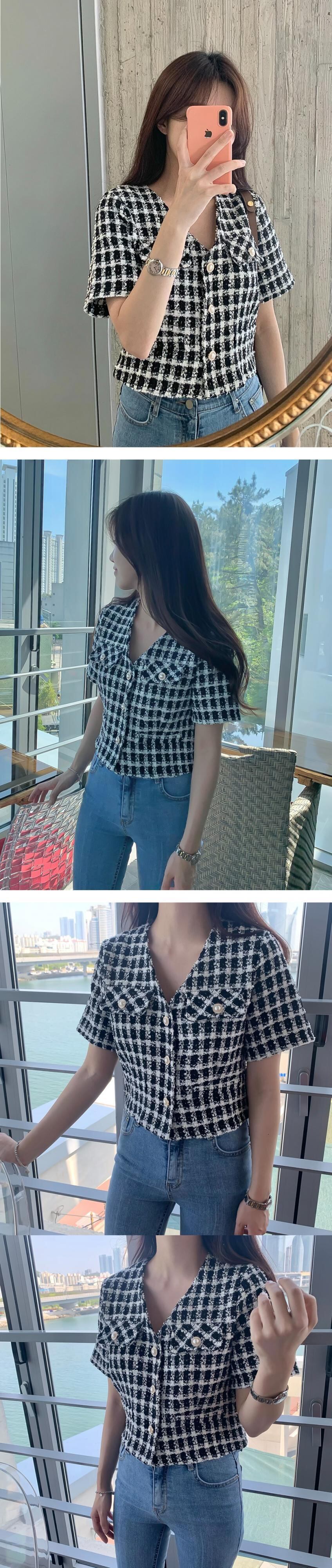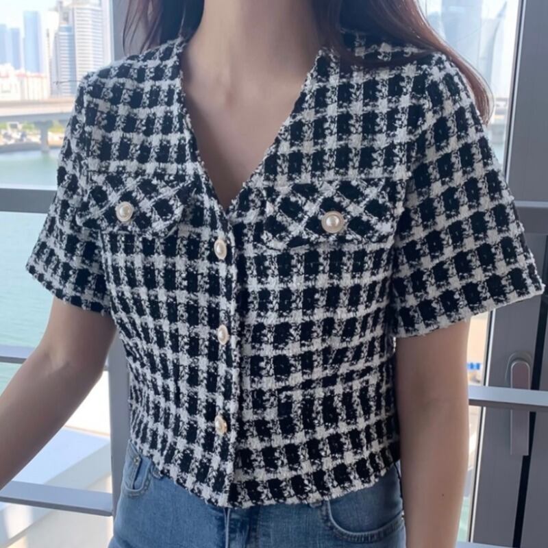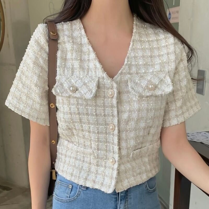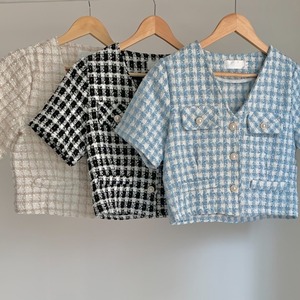 ツィードショートジャケット サマースタイルVネック格子柄カーディガントップス 大人ガーリー スウィート キュート カジュアル 夏物 韓国婦人89900685929