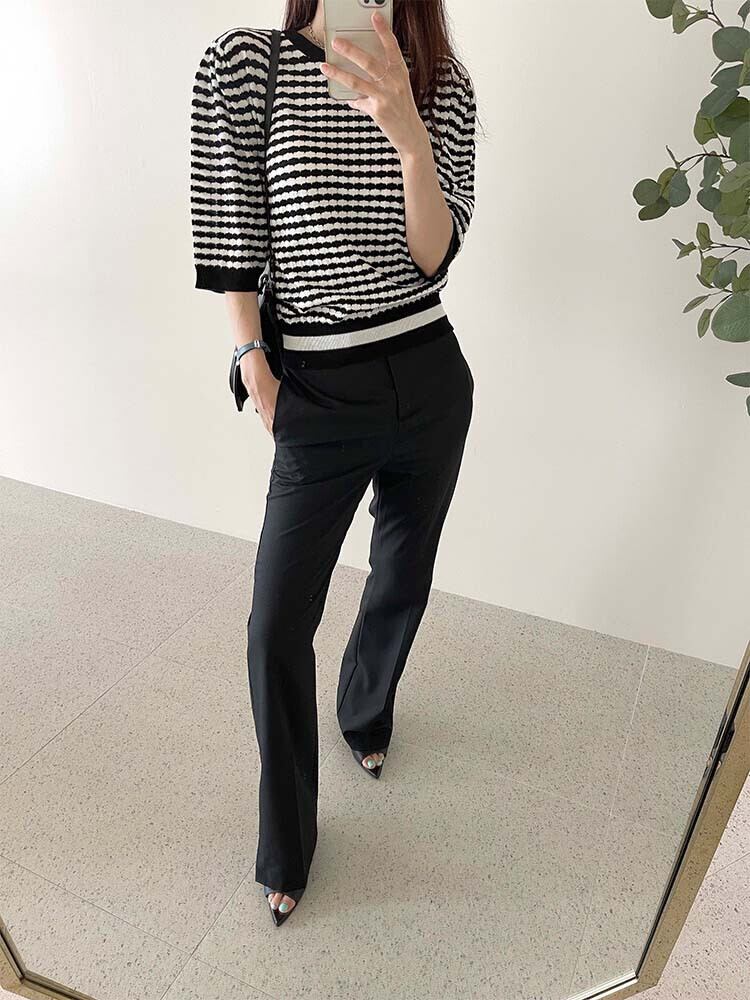 サマースタンダードラウンドネックルーズスリーブ薄手格子柄セーター トップス レディース レトロ 夏物 Oネック 韓国婦人23886363663