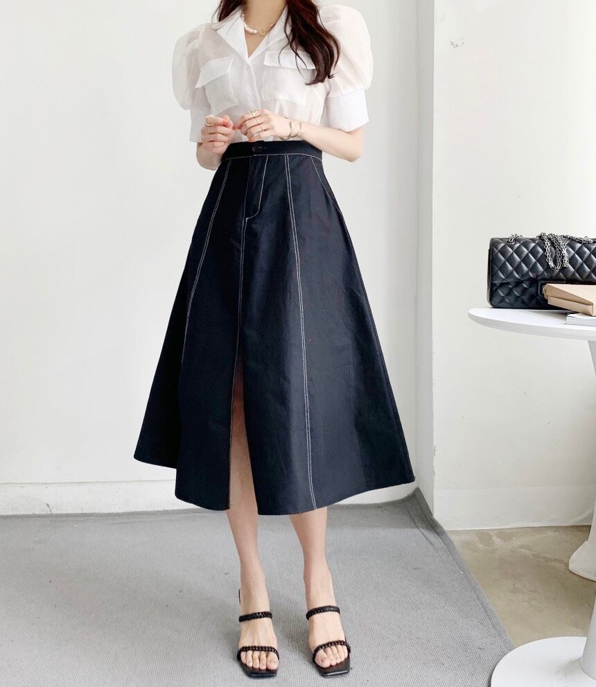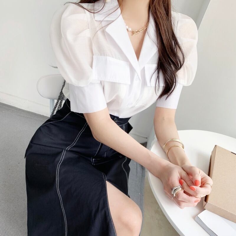 サマースタンダードスリーブシャツ スリットロングスカート レトロ 夏物 韓国婦人55854764445