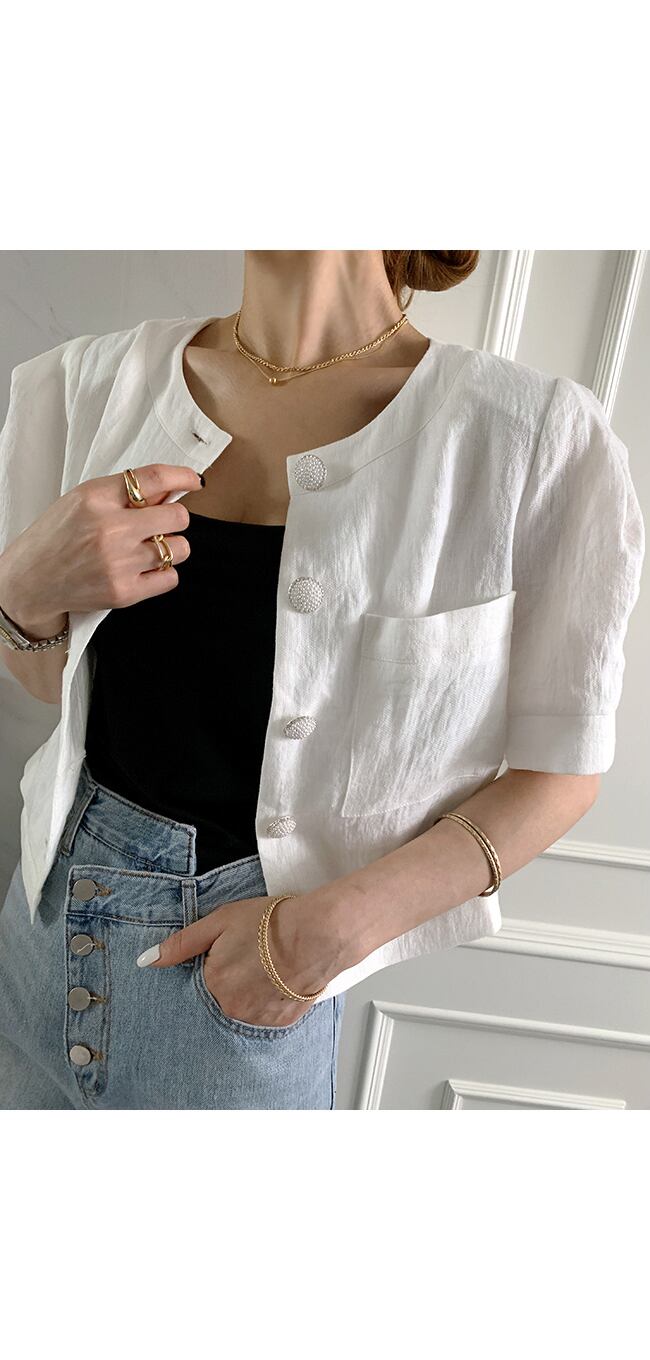 サマーシングルブレストダブルポケットルーズラウンドネックシャツ レディース 夏物 Oネック 韓国婦人56434395816