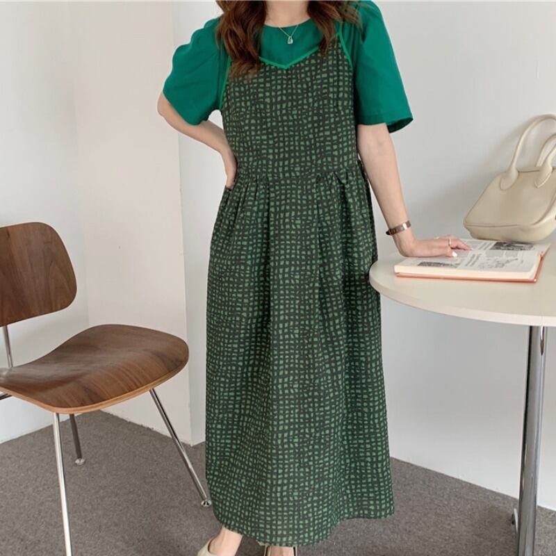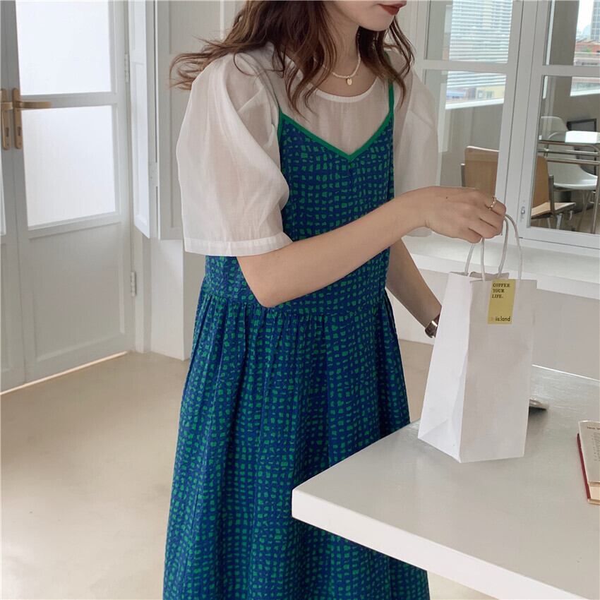 サマースリーブシャツ スタンダード格子柄Vネックスカート レトロ 夏物 韓国婦人22377426402