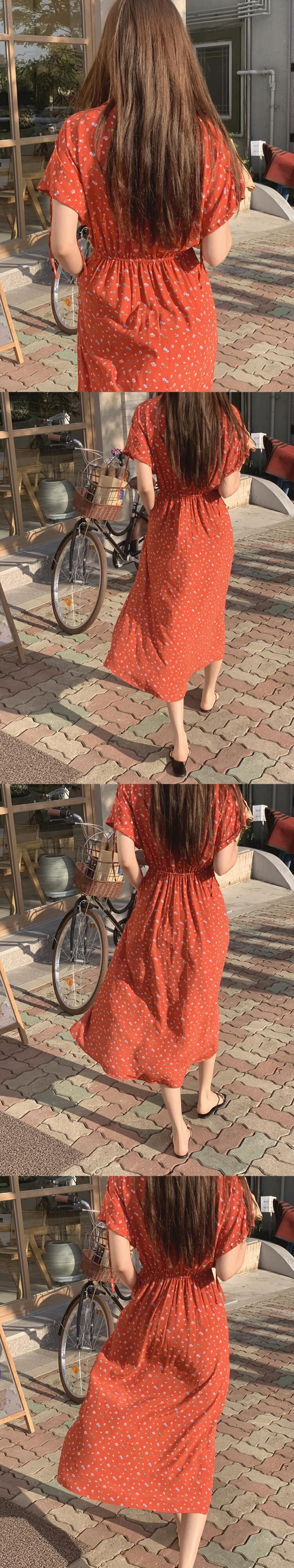 サマースタンダードレッドフローラルウェストシフォンシャツ ドレス レトロ 夏物 花柄 韓国婦人40613495497