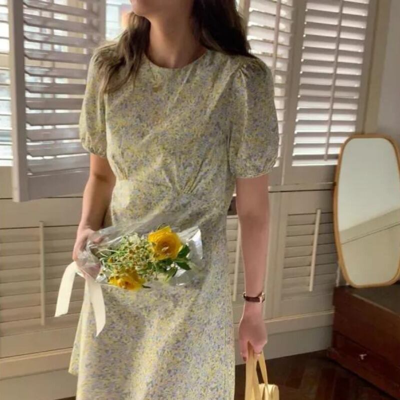 サマーラウンドネックスリーブフローラルドレス スカート 夏物 花柄 Oネック フラワーデザイン 韓国婦人32601903185