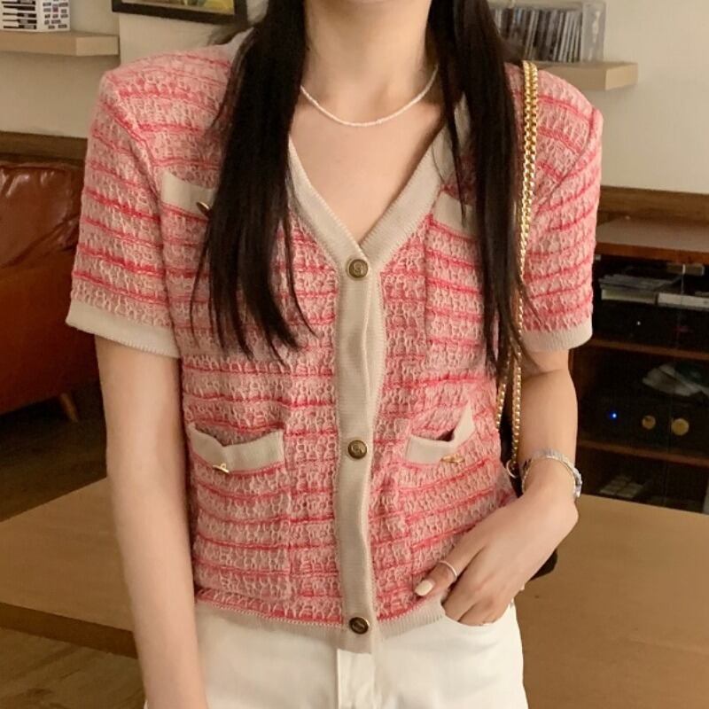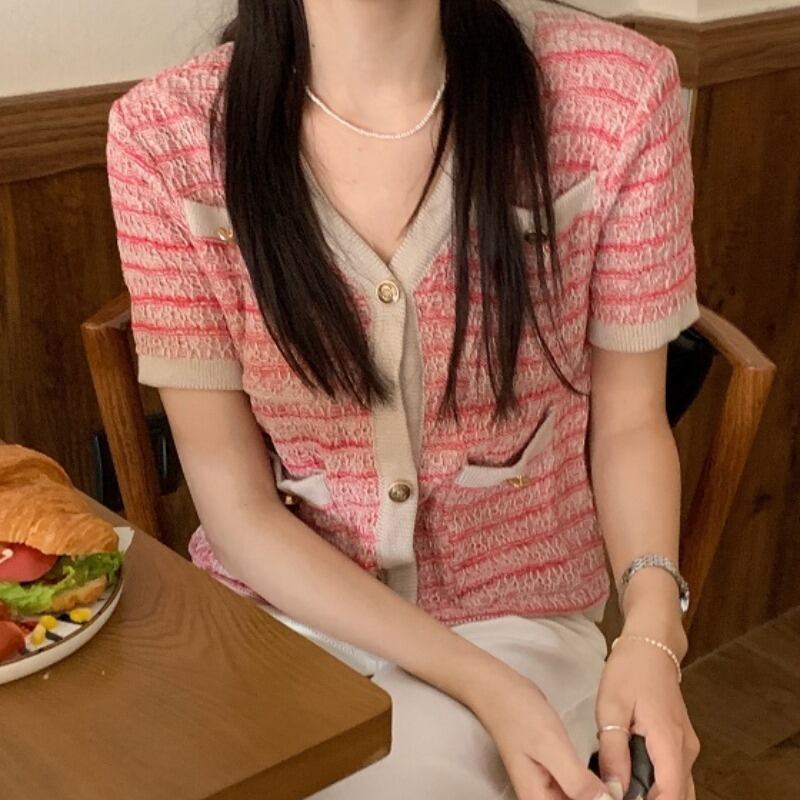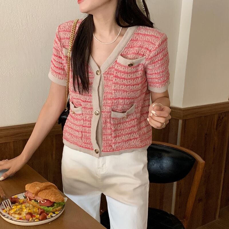 サマースタンダードカラーVネックポケットニットカーディガンシャツ レディース レトロ 夏物 韓国婦人6061001098