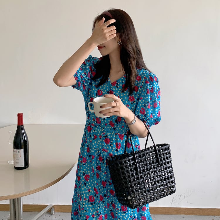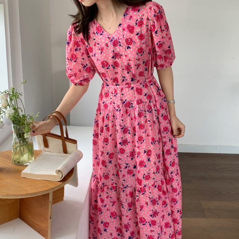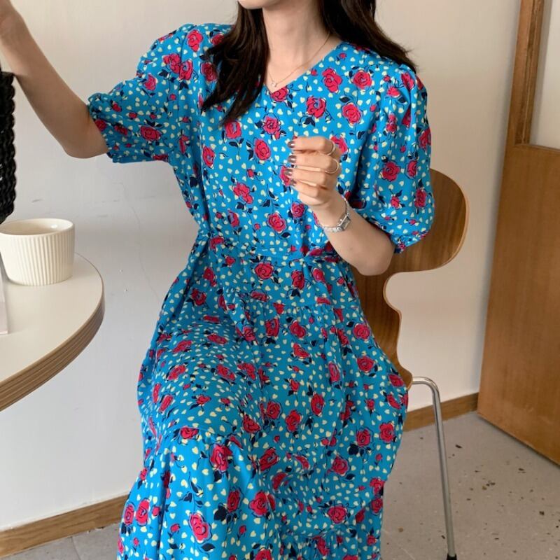 スタンダードプリント柄スリーブウェストロングルーズVネックドレス レディース レトロ 韓国婦人66060958025