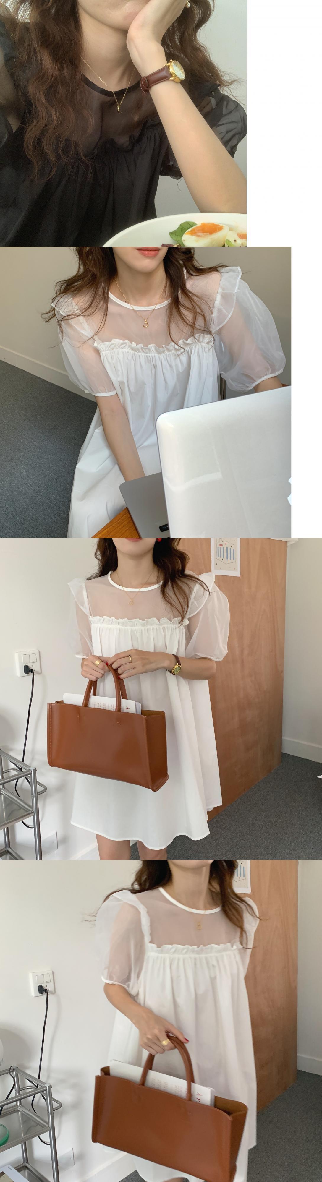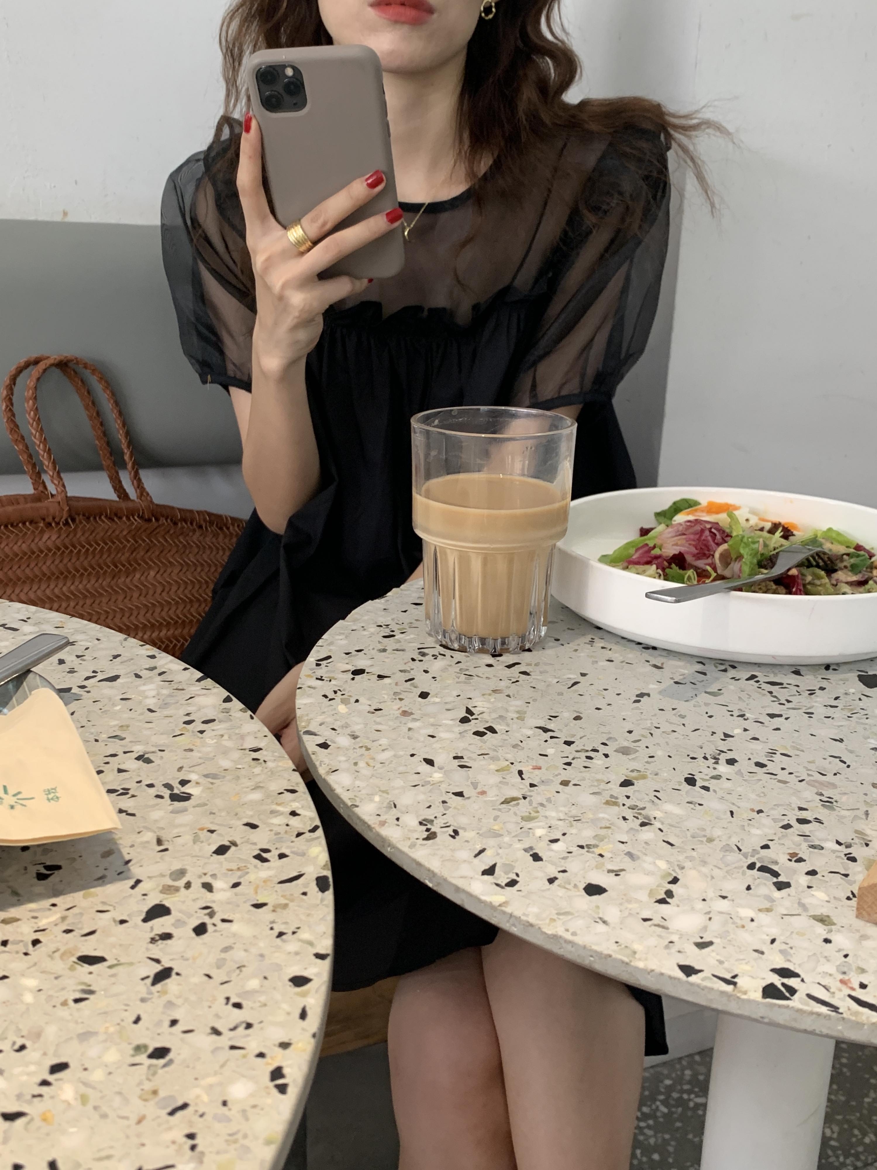 ラウンドネックメッシュスリーブルーズドレス 大人ガーリー スウィート キュート カジュアル Oネック ステッチ 韓国婦人9457608579