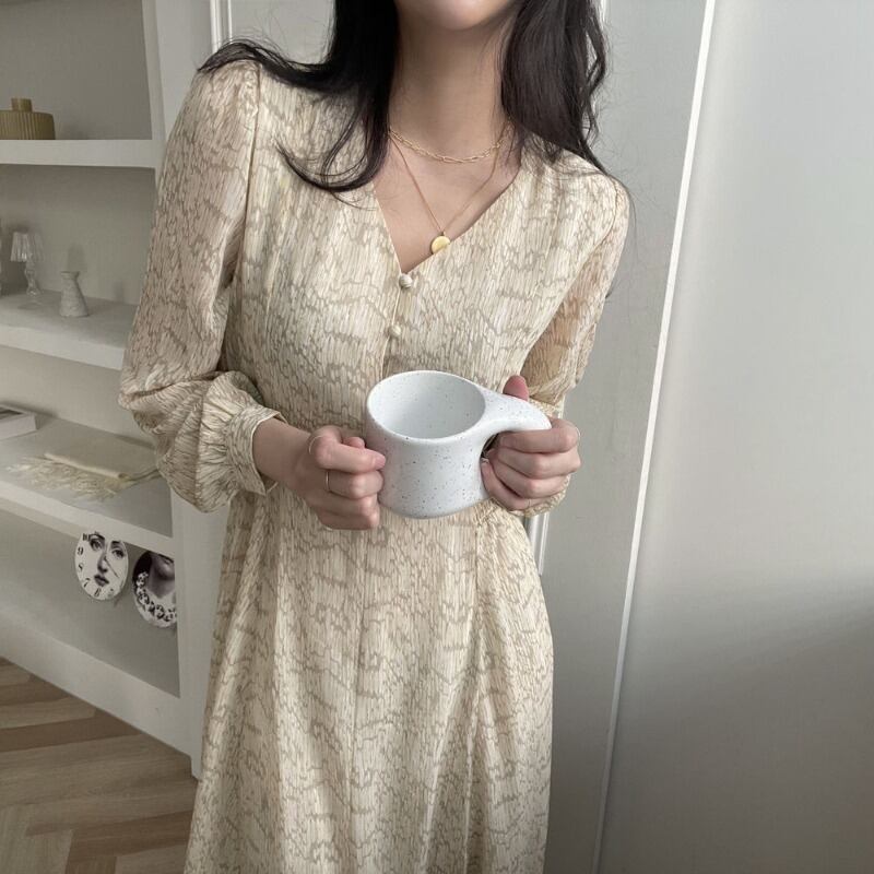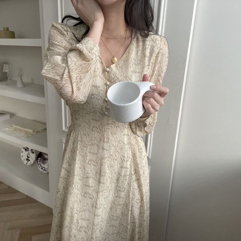 オータムスタンダードVネックバックルウェストロングプリントドレス レトロ 秋物 韓国婦人21128163626