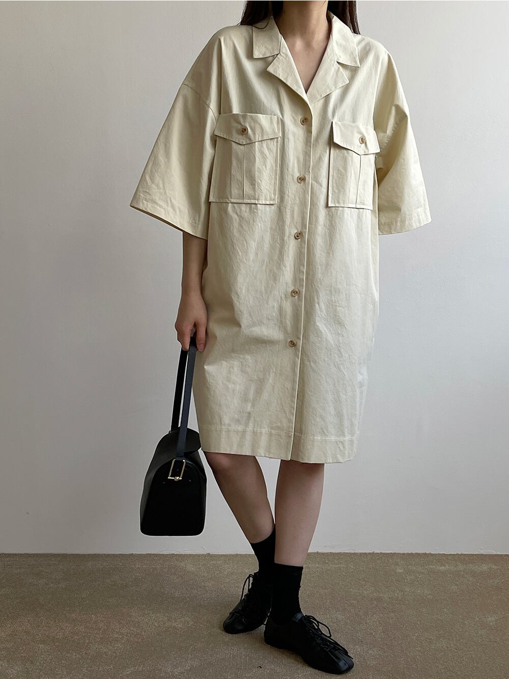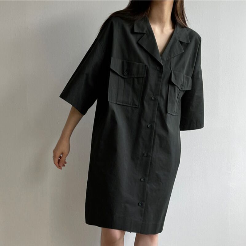 カラーダブルポケットシングルブレストカジュアルドレス ルーズスカート サマー 夏物 韓国婦人41681825990