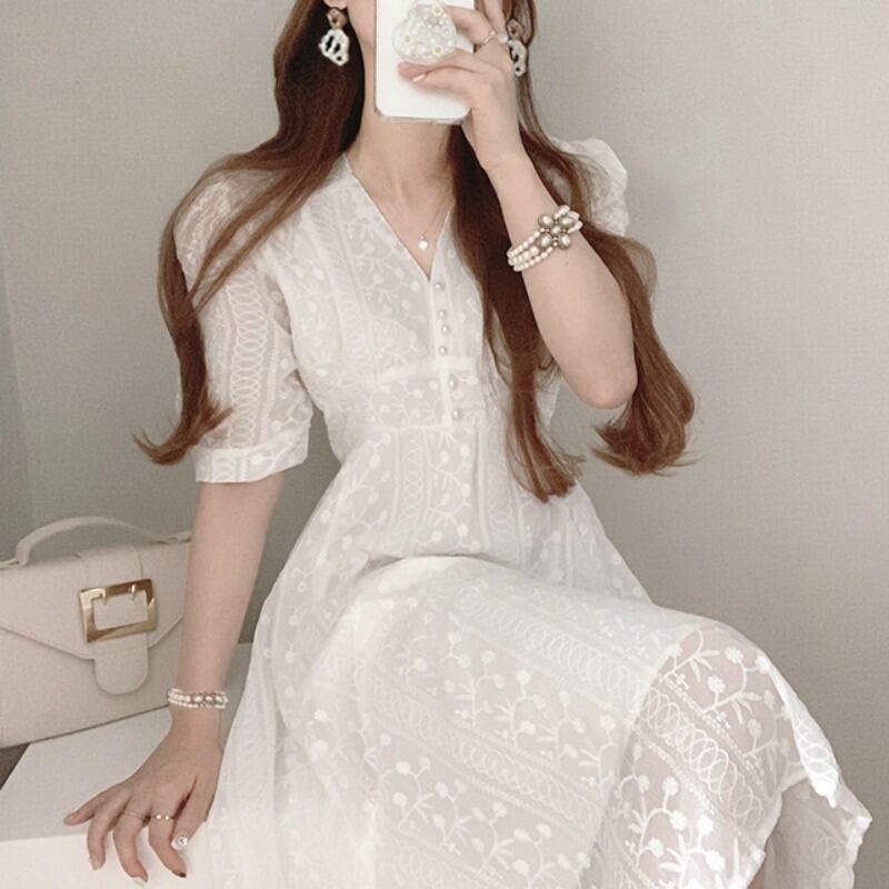 サマーVネックスリーブ刺繍ウェストジャカードドレス 夏物 韓国婦人9961243024