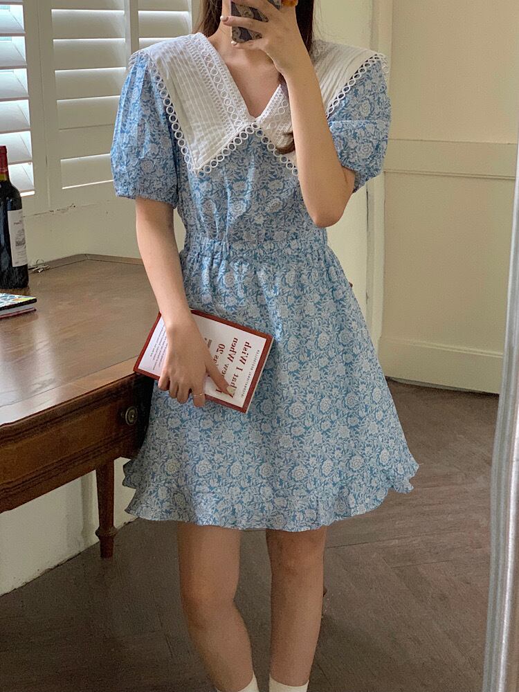 サマーカラーウェストスリーブフローラルドレス 夏物 花柄 韓国婦人50443469983