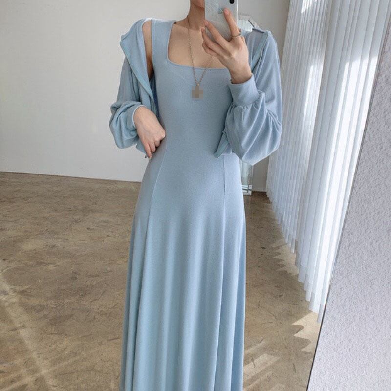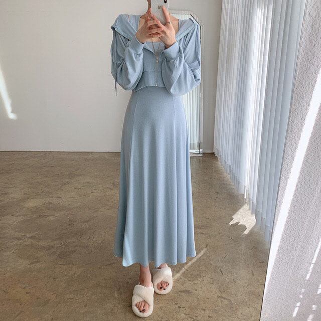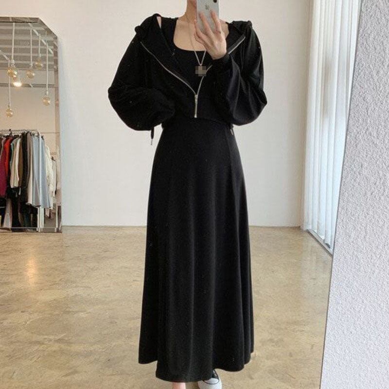 オータムウィンタースタイルルーズショートジッパーフードセーター ロングスカート レディース 秋物 冬物 スクウェア 韓国婦人71731113548