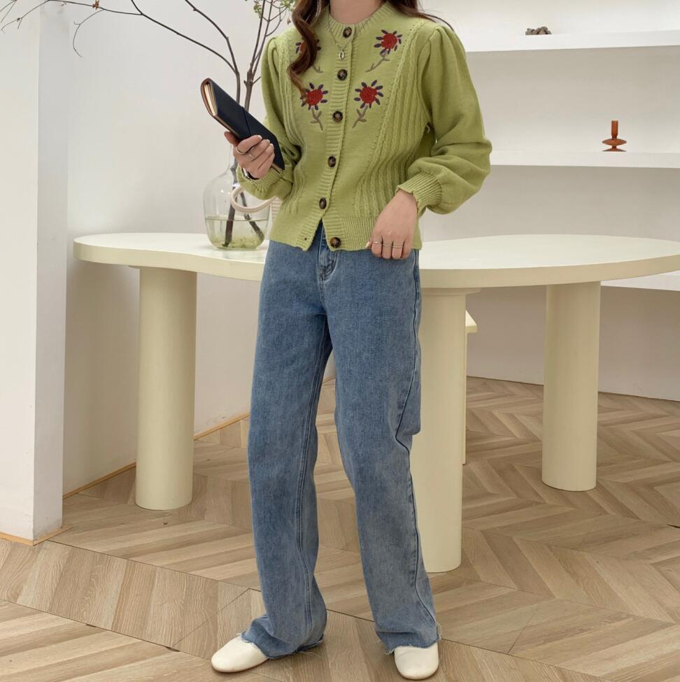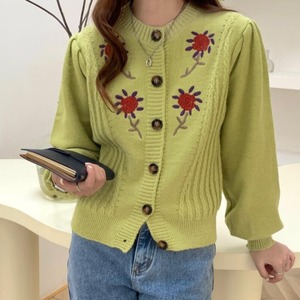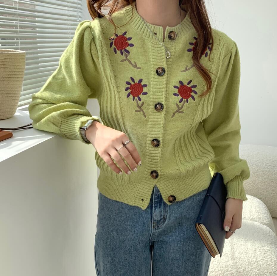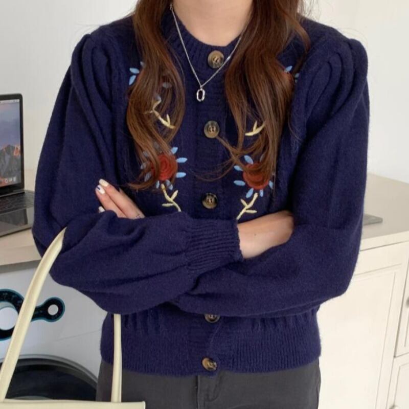 オータムスタンダードスタイルルーズニットセーター カーディガンジャケット レディース レッド レトロ 刺繍 秋物 フラワーデザイン 韓国婦人66434970903