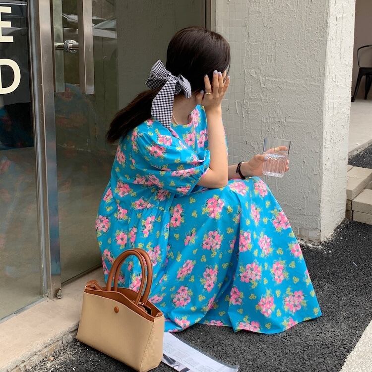 サマースタンダードフローラルラウンドネックスリーブスタイルロングドレス レトロ 大人ガーリー スウィート キュート カジュアル 夏物 花柄 Oネック 韓国婦人76003880294