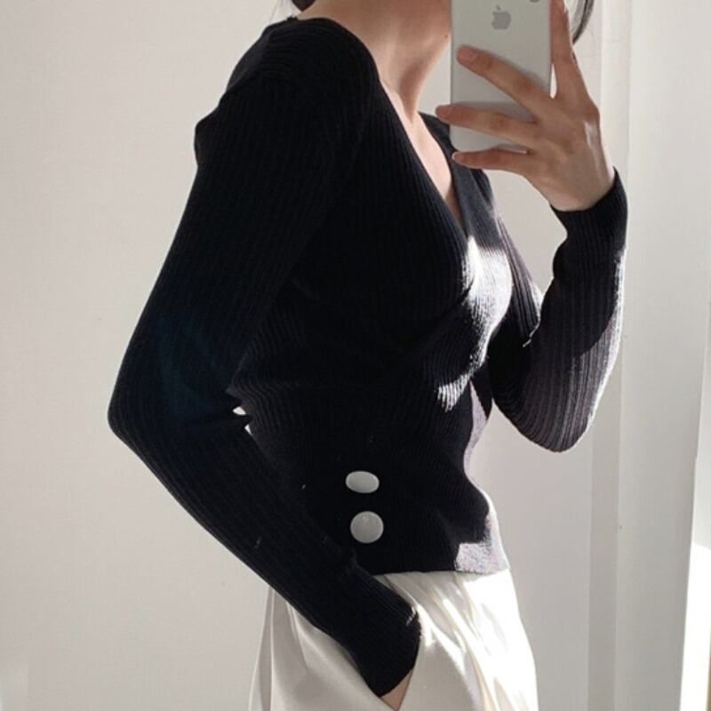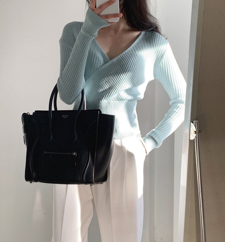 オータムクロスVネックスリムウェストセーター トップス レディース ロング 秋物 韓国婦人71066385904