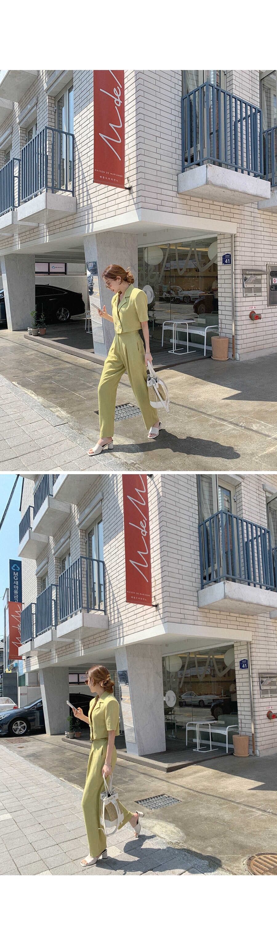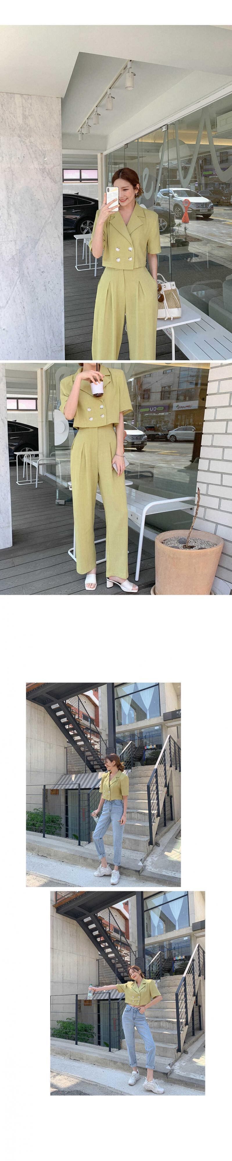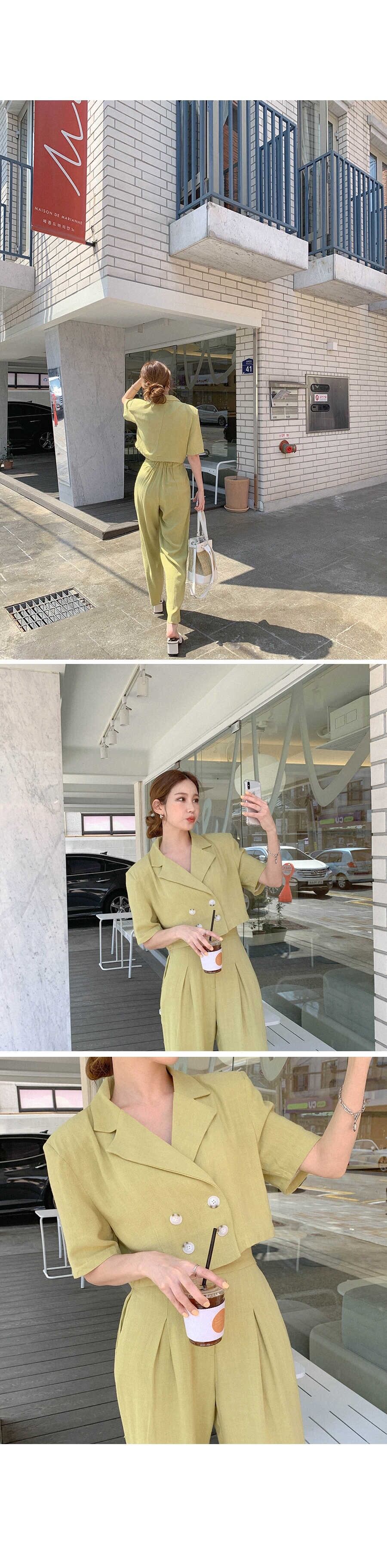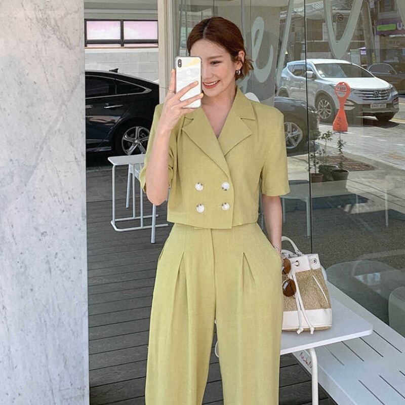サマーショートカラーシャツ ハイウェストプリーツパンツ コットン 夏物 グリーン 韓国婦人75371608679