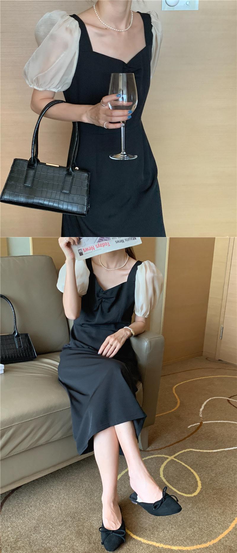 サマースタイルカラーシフォンスリーブロングドレス 夏物 スクウェア 韓国婦人13576031700