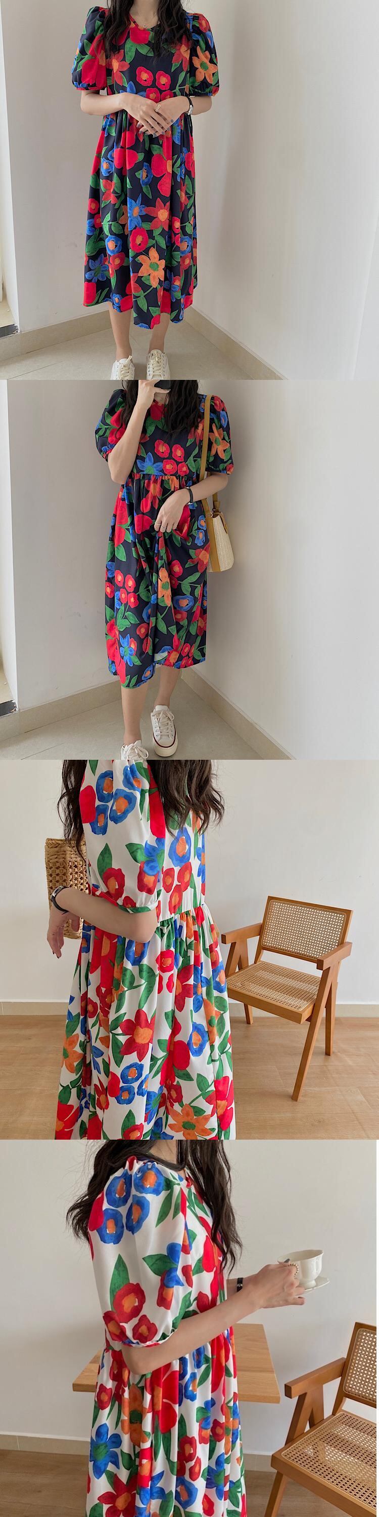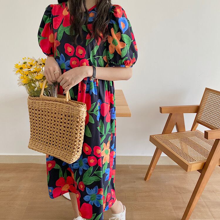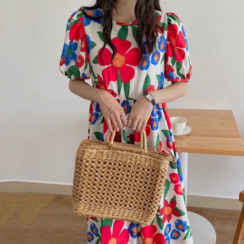 サマースタンダードFlowerデザイン スリーブドレス ハイウェストウェストルーズスリムロングスカート レトロ 大人ガーリー スウィート キュート カジュアル 夏物 フラワーデザイン 韓国婦人41401670075