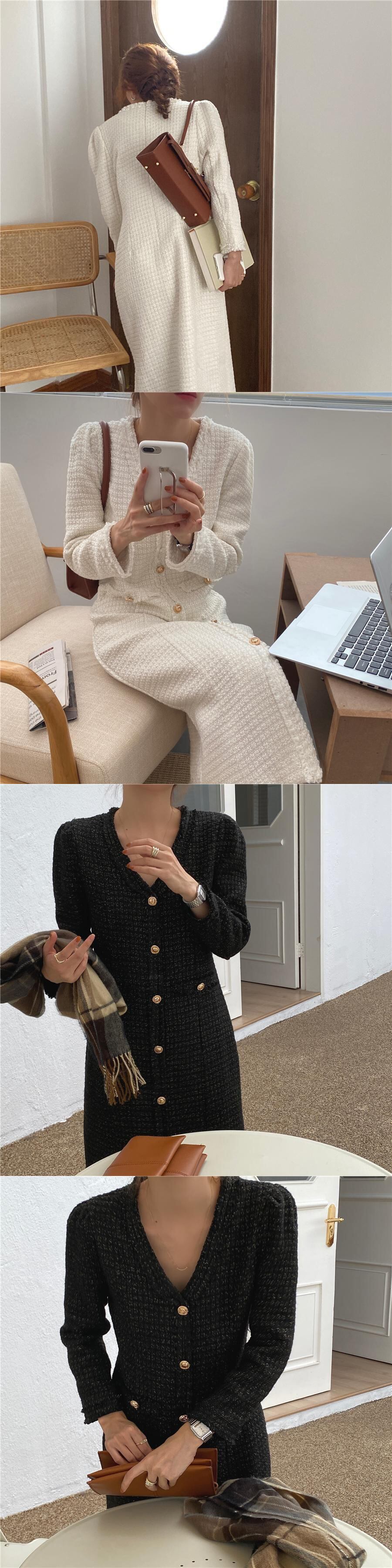 オータムウィンターVネックロングツィードドレス レディース 秋物 冬物 韓国婦人66272889912