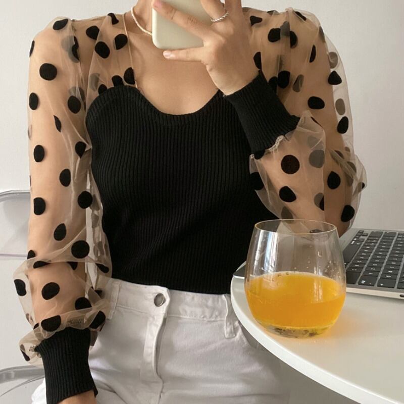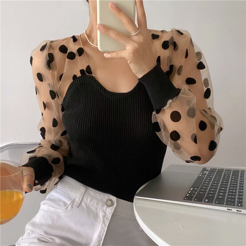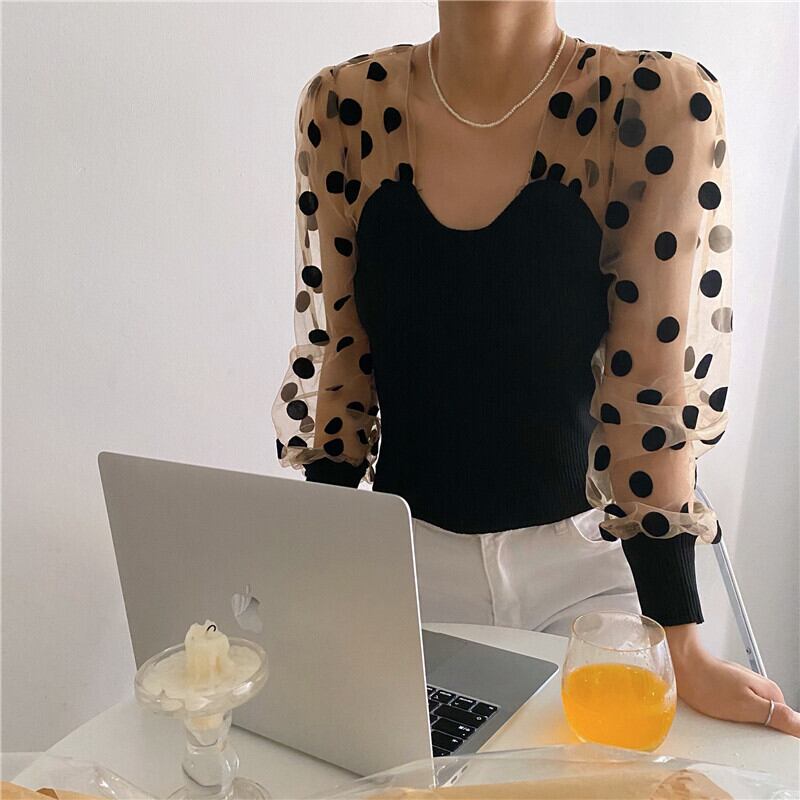 オータムスタンダードスリムフィット水玉スリーブシフォンセーター トップス レディース レトロ 秋物 スクウェア ステッチ 韓国婦人75591255026