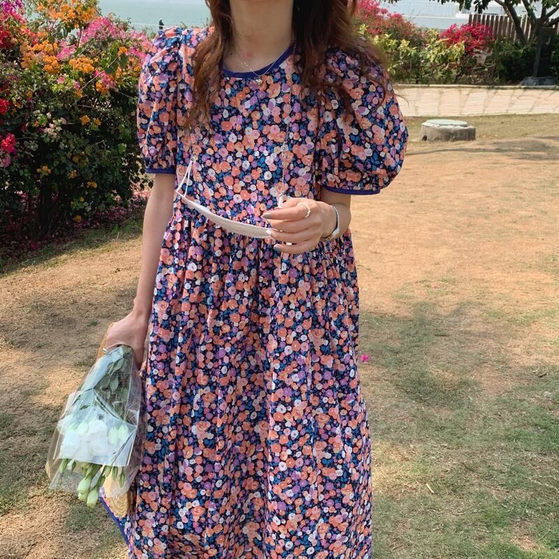 スリーブフローラルドレス ルーズ薄手スカート サマー 大人ガーリー スウィート キュート カジュアル 夏物 花柄 韓国婦人81898955979