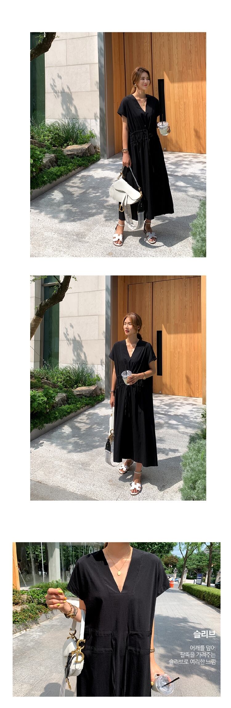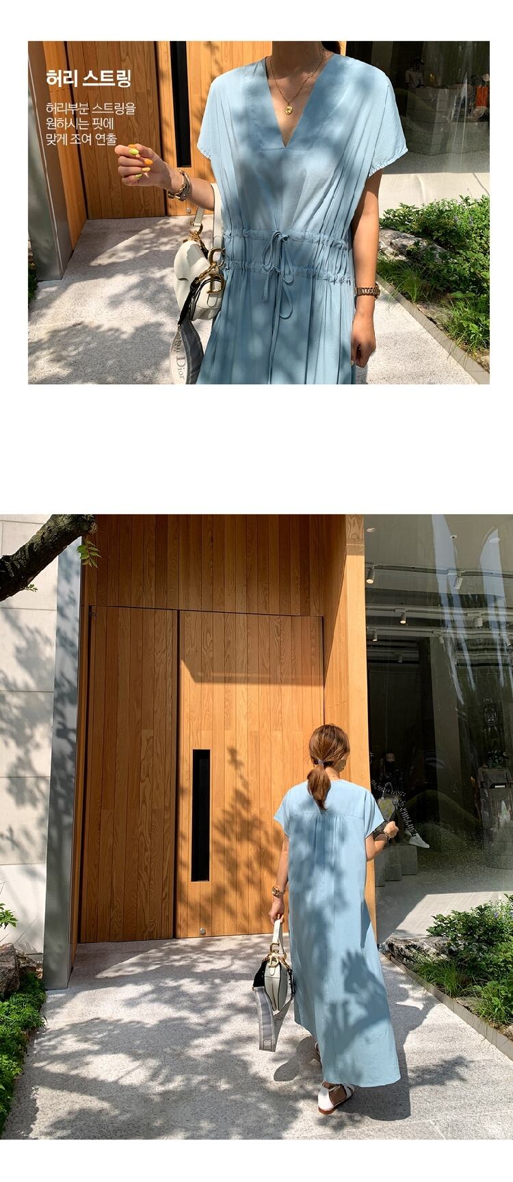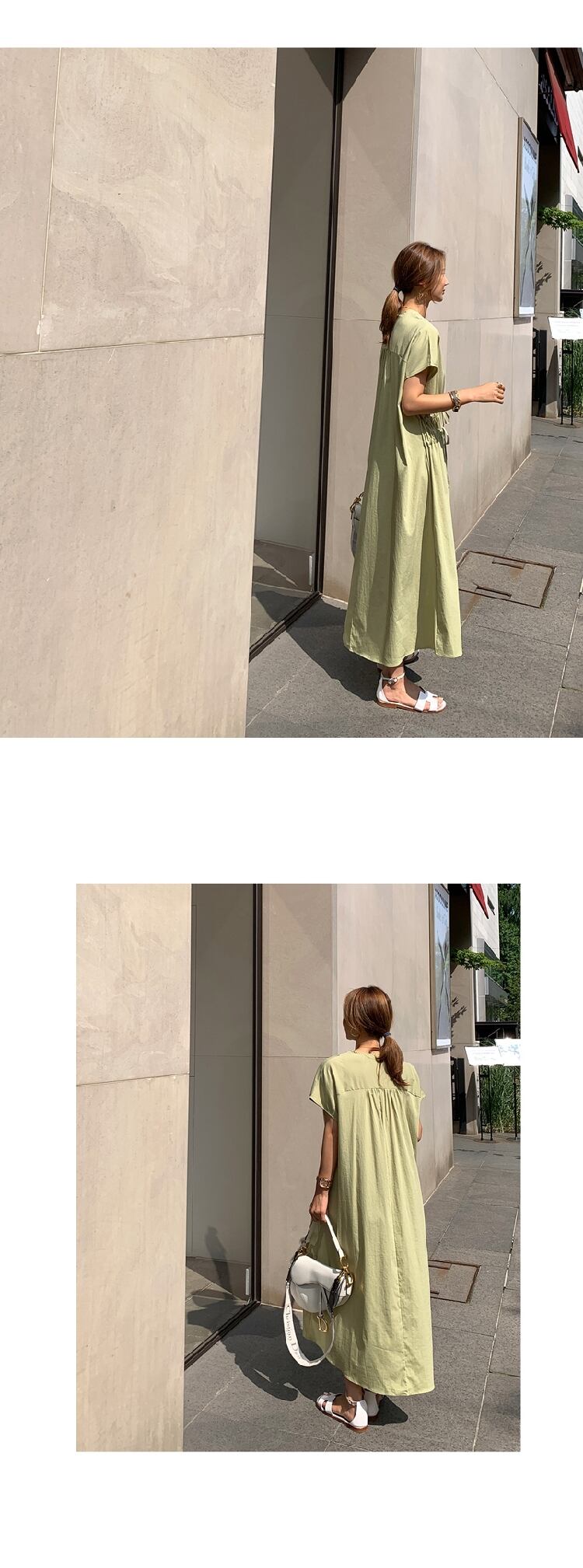 ウェストギャザーVネックドレス サマーソリッド カラーロングスカート エレガント 夏物 ソリッドカラー 韓国婦人82609687239