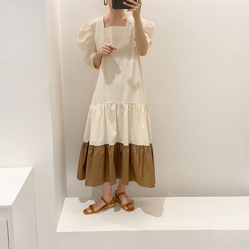 サマースタンダードカラールーズプリーツスリーブドレス レトロ 夏物 スクウェア ステッチ 韓国婦人22273106480