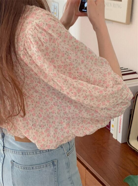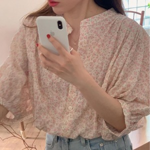 サマーフローラルスリーブシャツ トップス レディース ピンク 大人ガーリー スウィート キュート カジュアル 夏物 花柄 韓国婦人51792136511