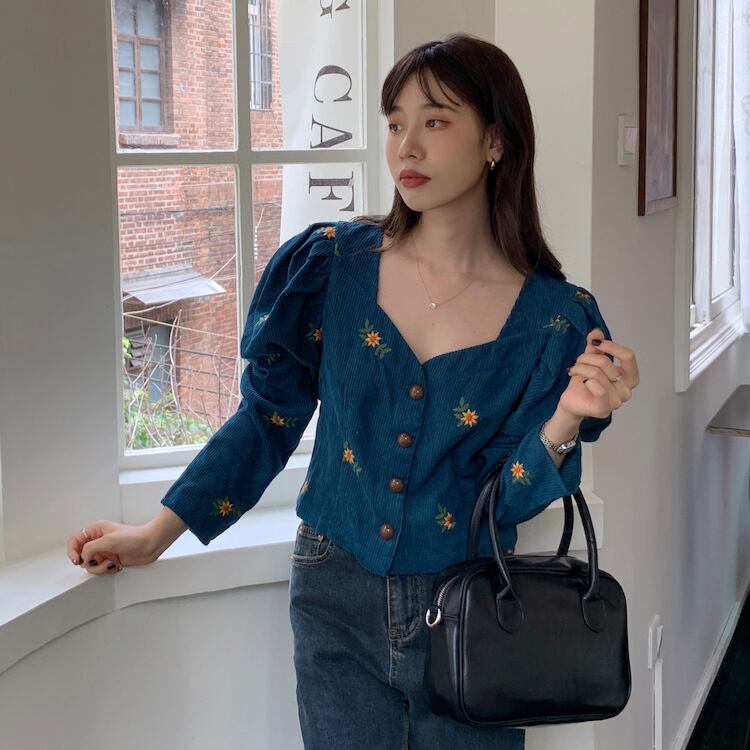 オータムスタンダードスタイルカラーコーデュロイスリーブショートシャツ トップス レディース レッド レトロ 刺繍 秋物 スクウェア 韓国婦人82646403034
