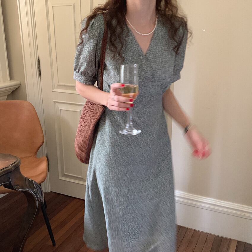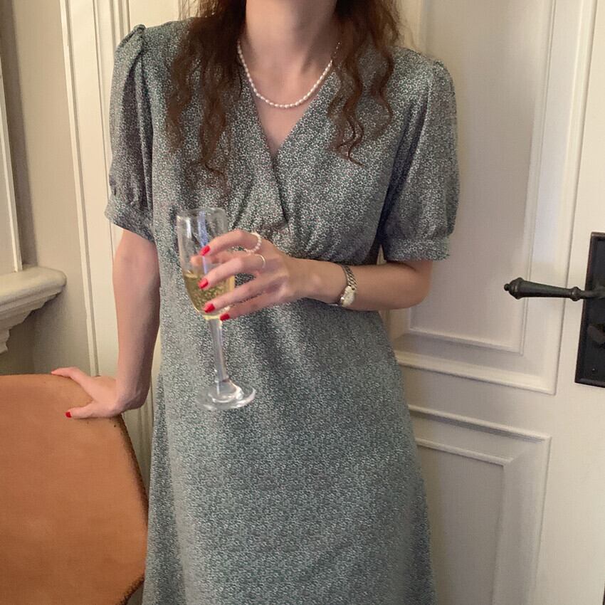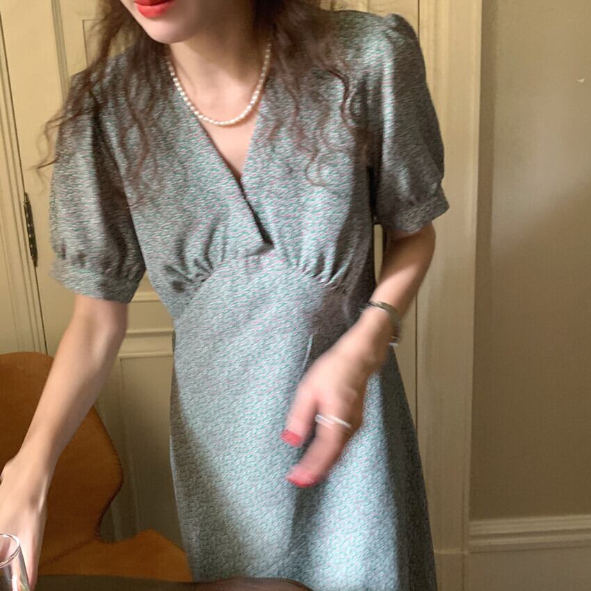 Vネックフローラルウェストドレス サマースタンダードスリーブシフォンスカート レトロ 夏物 花柄 韓国婦人93119355619