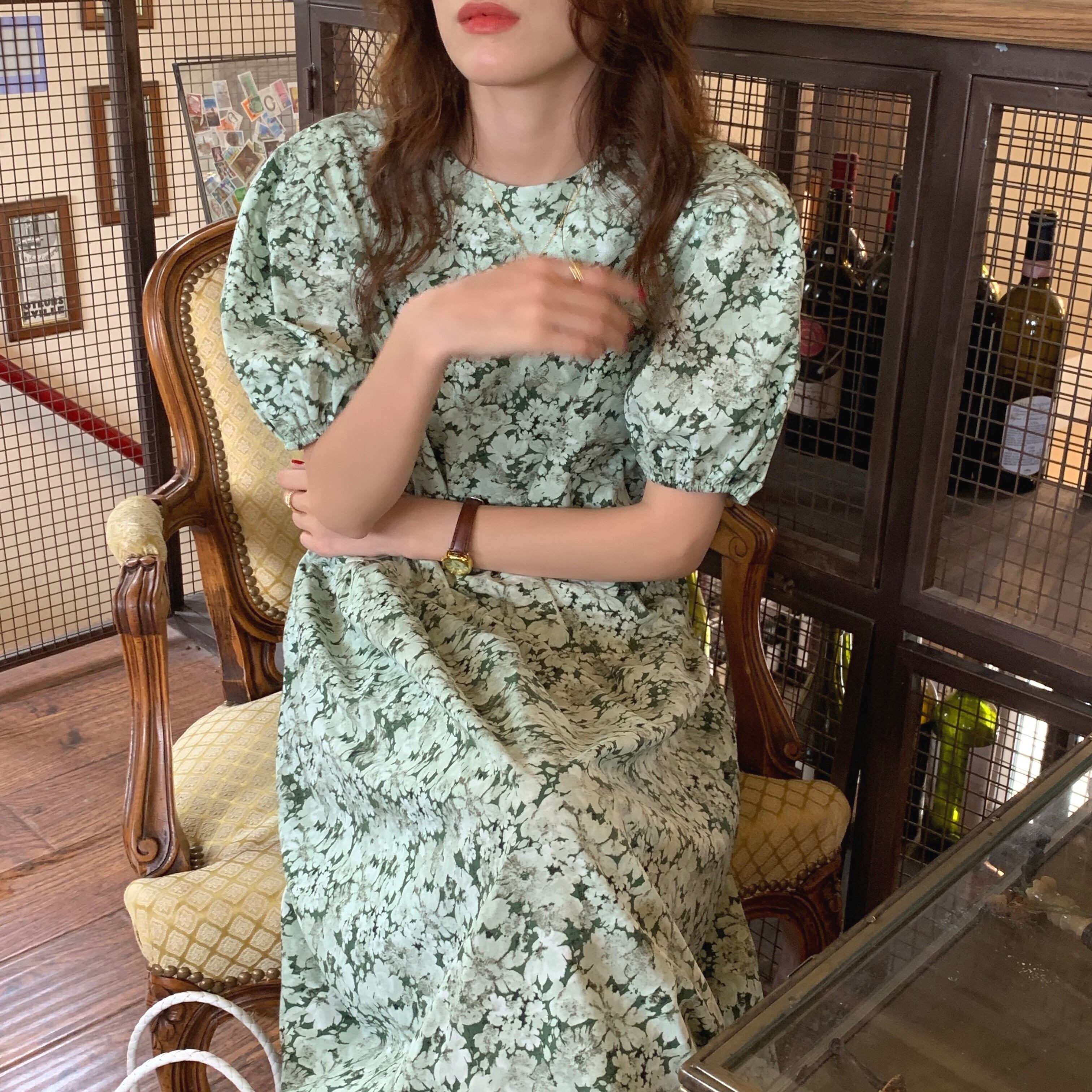 サマースタンダードバックロングスリーブプリントドレス レトロ 夏物 韓国婦人58468973895