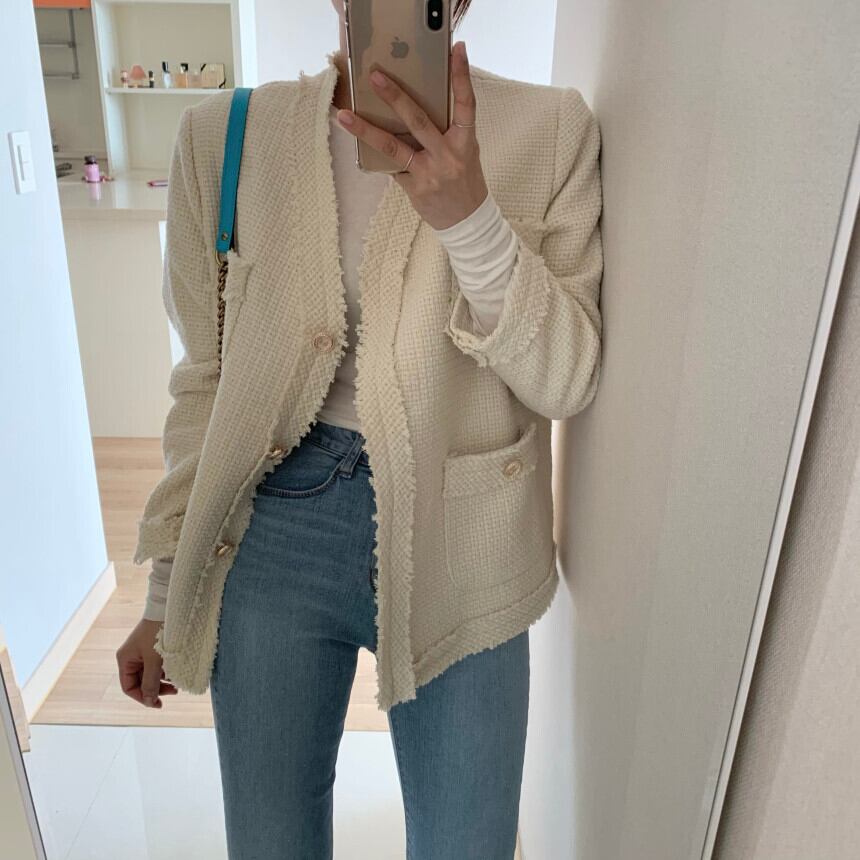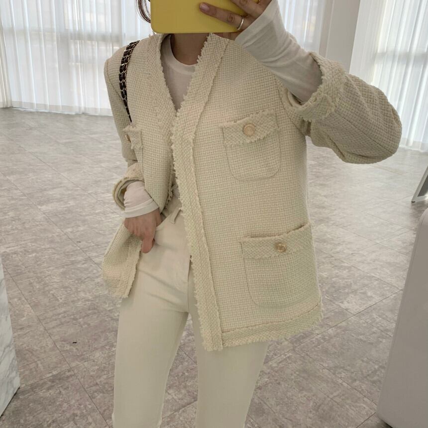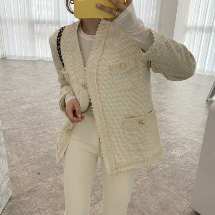 オータムウィンターVネックツィードジャケット レディース 秋物 冬物 ポケット多め マルチポケット 韓国婦人94397478872