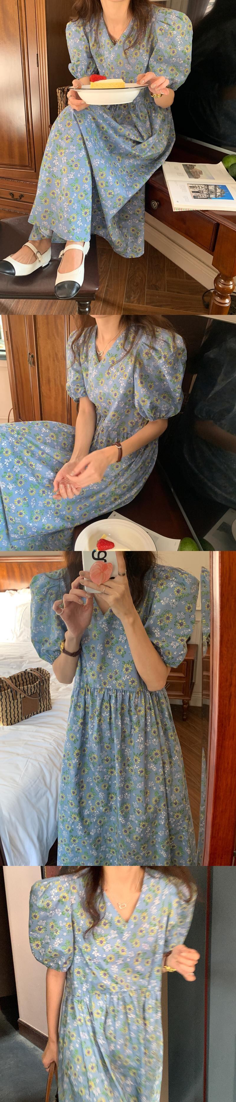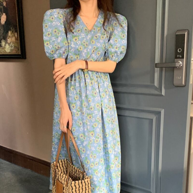サマースカート スリーブフローラルVネックルーズドレス ウェストスタンダードロング レトロ 夏物 花柄 韓国婦人10123453971