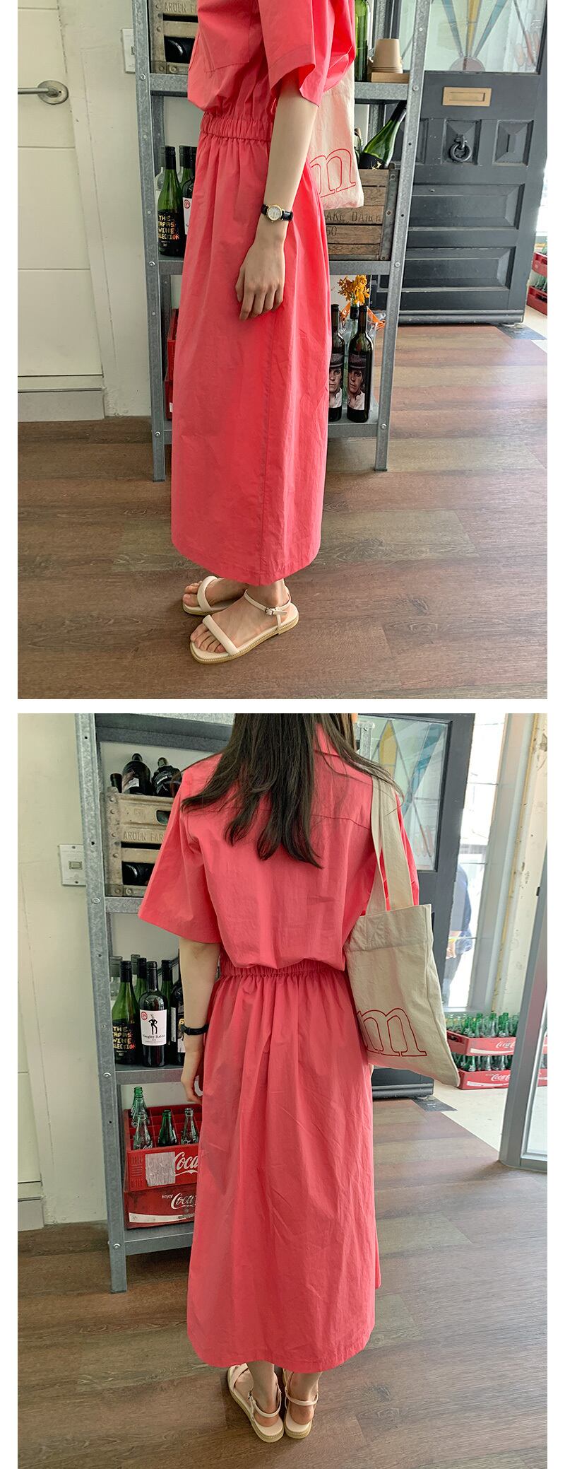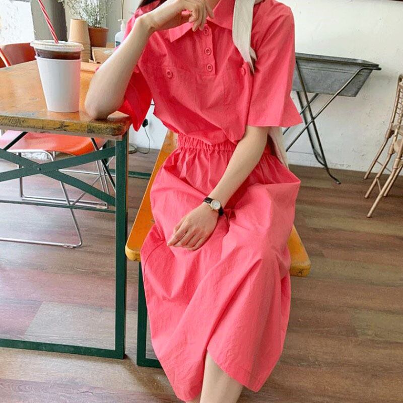 サマースタンダードカラーダブルポケットストレッチウェスト薄手ドレス レトロ エラスティック 伸縮 夏物 韓国婦人10295033453