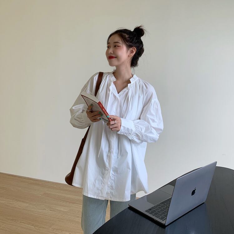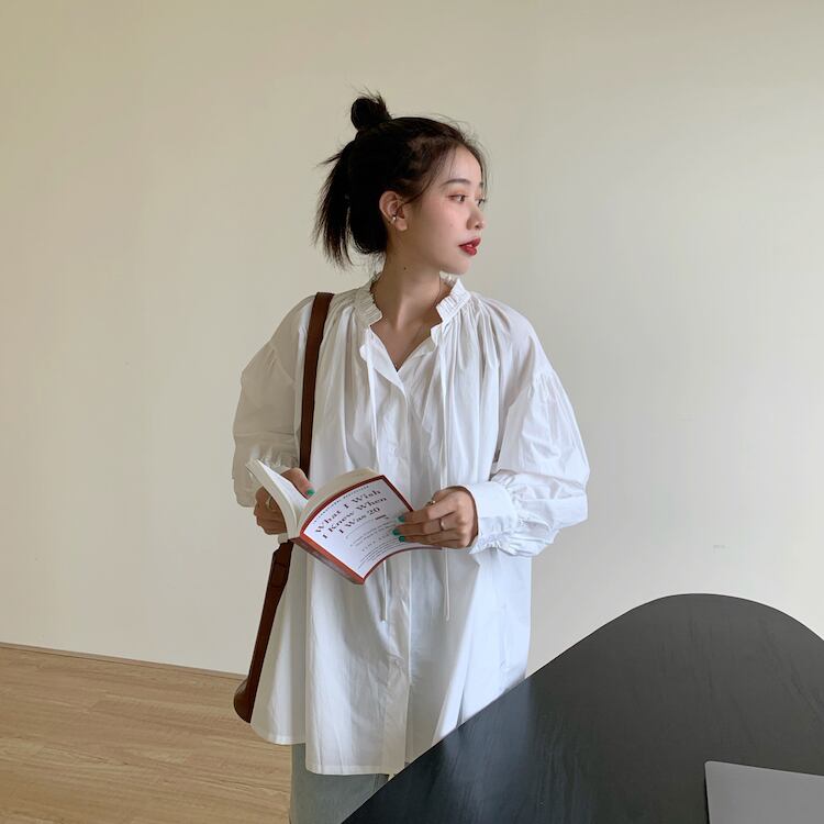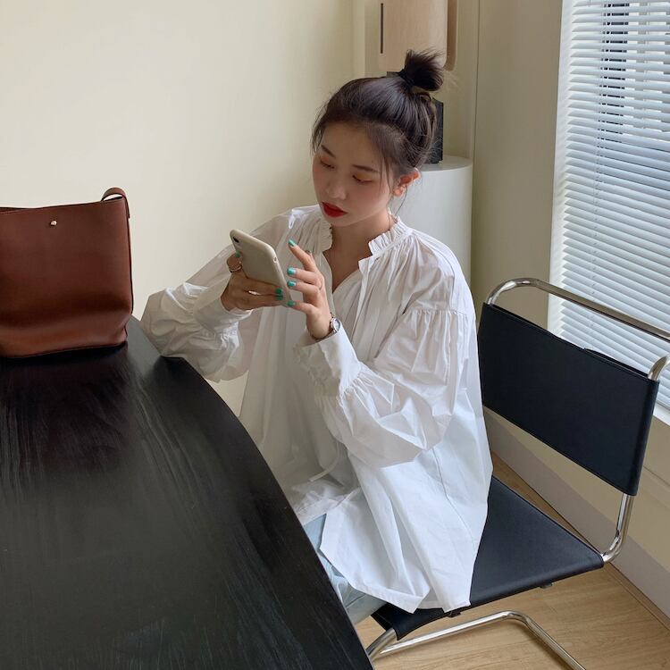 オータムスタンドカラーカラールーズシャツ トップス レディース ランタンスリーブ 秋物 韓国婦人15746294242