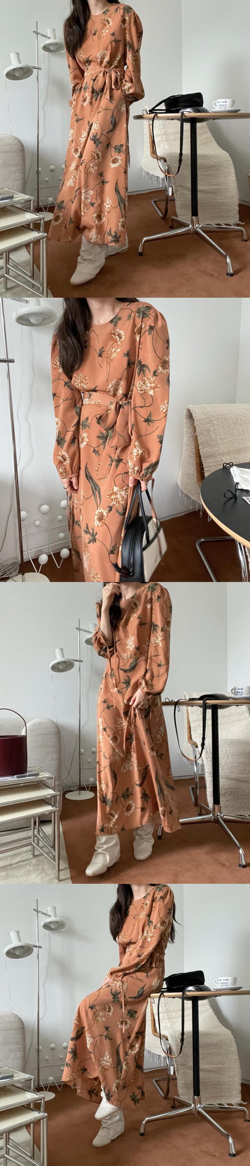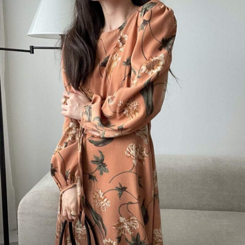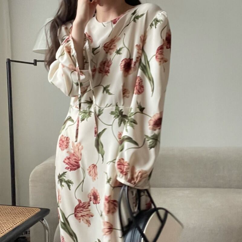 オータムラウンドネックプリントシフォンドレス ロングスカート 秋物 Oネック 韓国婦人44515852512