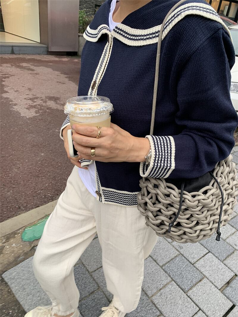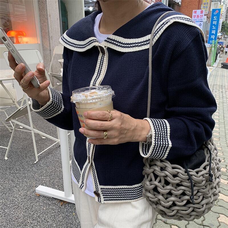 オータムウィンタースタンダードスタイルルーズネイビーカラーニットセーター カーディガンレディース レトロ 秋物 冬物 韓国婦人19292223499