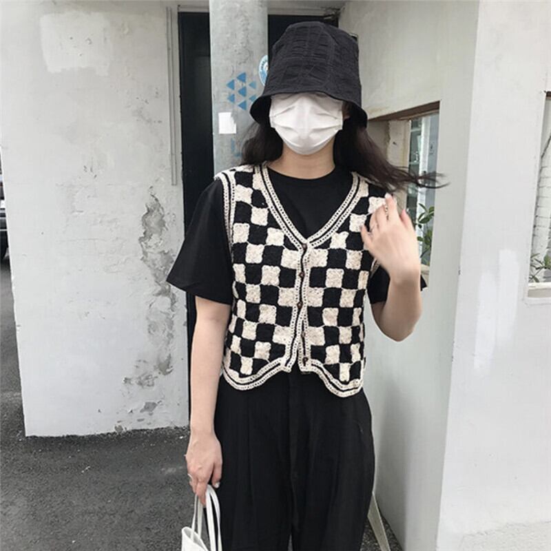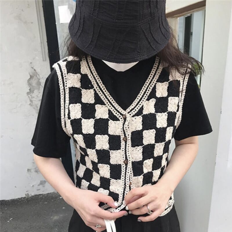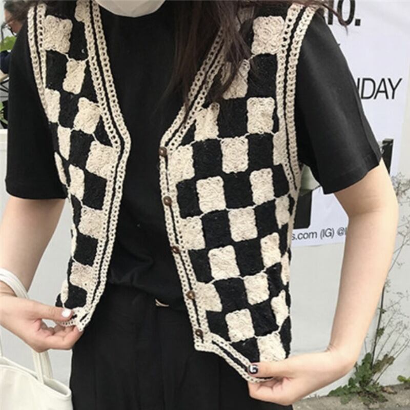 スタンダードVネックカラーブラックホワイト格子柄薄手ニットトップス レディース レトロ 韓国婦人82729582695
